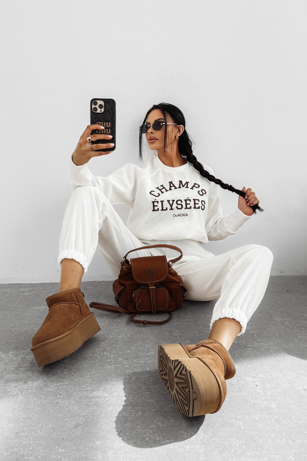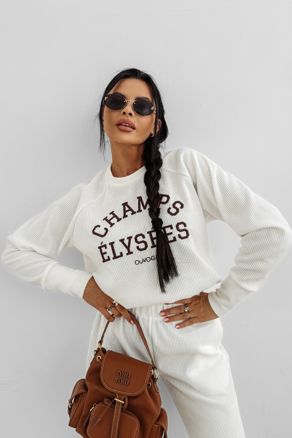 Sportliches Damen-Set aus weichem, bequemem Material. Das Oberteil ist ein Hoodie mit Logo-Print auf der Vorderseite, die Hose ist eine hoch taillierte Hose mit praktischen Taschen. Ideal für aktive Tage und zum Entspannen zu Hause.