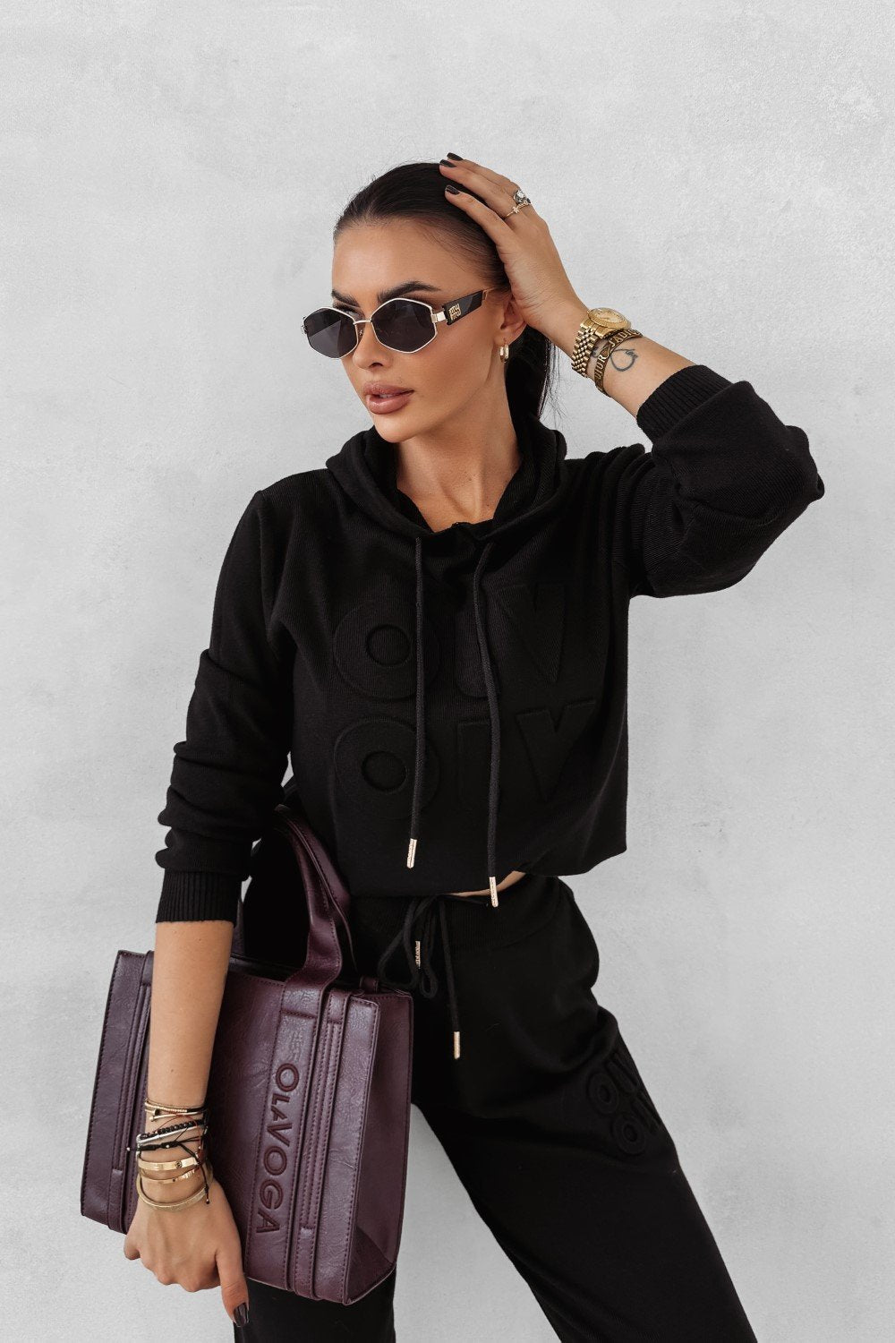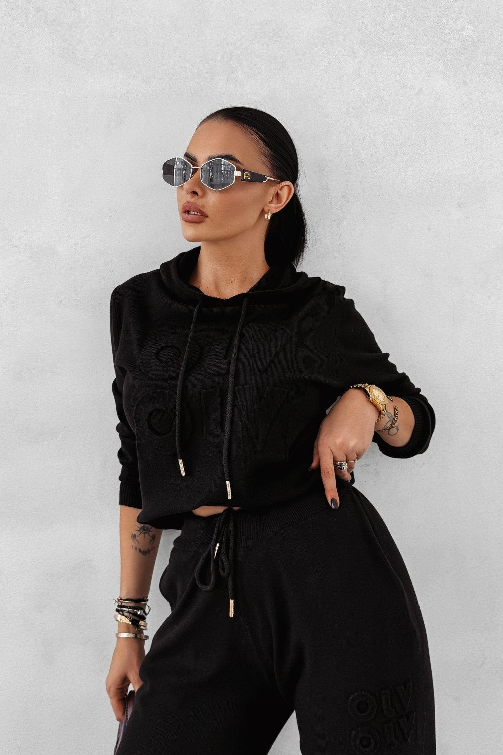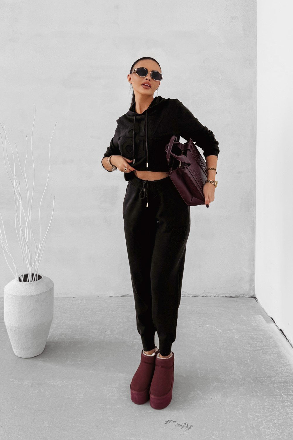 Női sportos szett, amely kényelmes és stílusos mindennapi viselethez. Puha, rugalmas anyagból készült. A felső kapucnis, elöl logónyomattal, az alsó pedig magas derekú nadrág zsebekkel. Tökéletes edzéshez vagy lazább napokra.