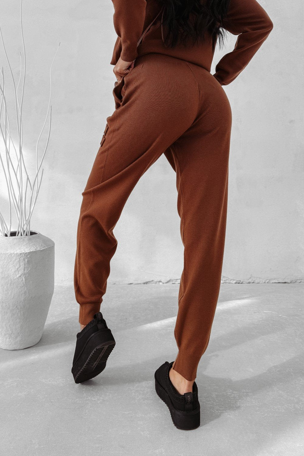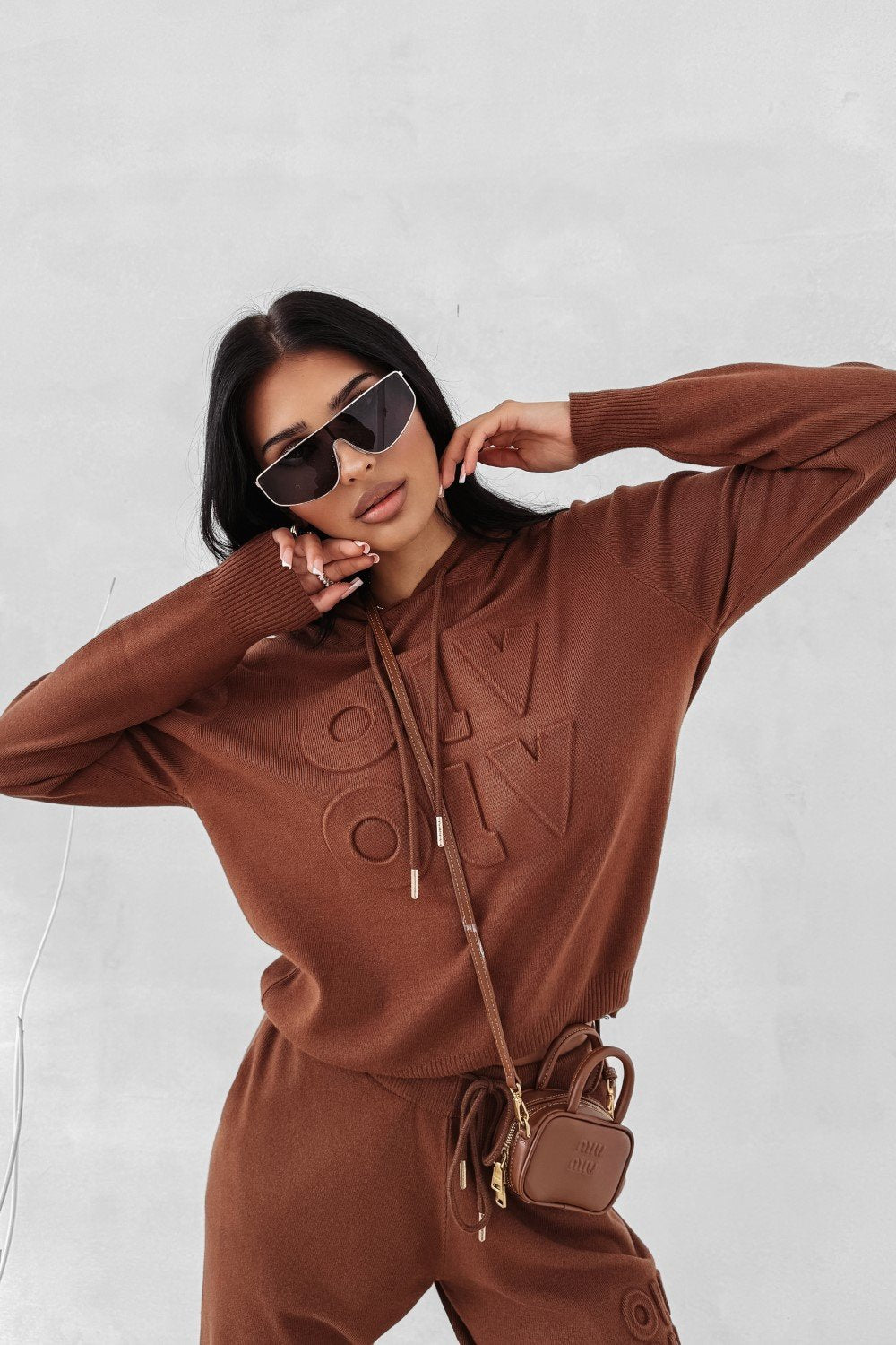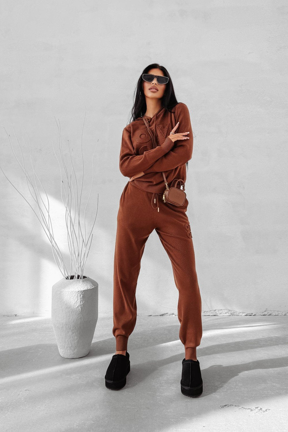 Női sportos szett, amely kényelmes és stílusos mindennapi viselethez. Puha, rugalmas anyagból készült. A felső kapucnis, elöl logónyomattal, az alsó pedig magas derekú nadrág zsebekkel. Tökéletes edzéshez vagy lazább napokra.