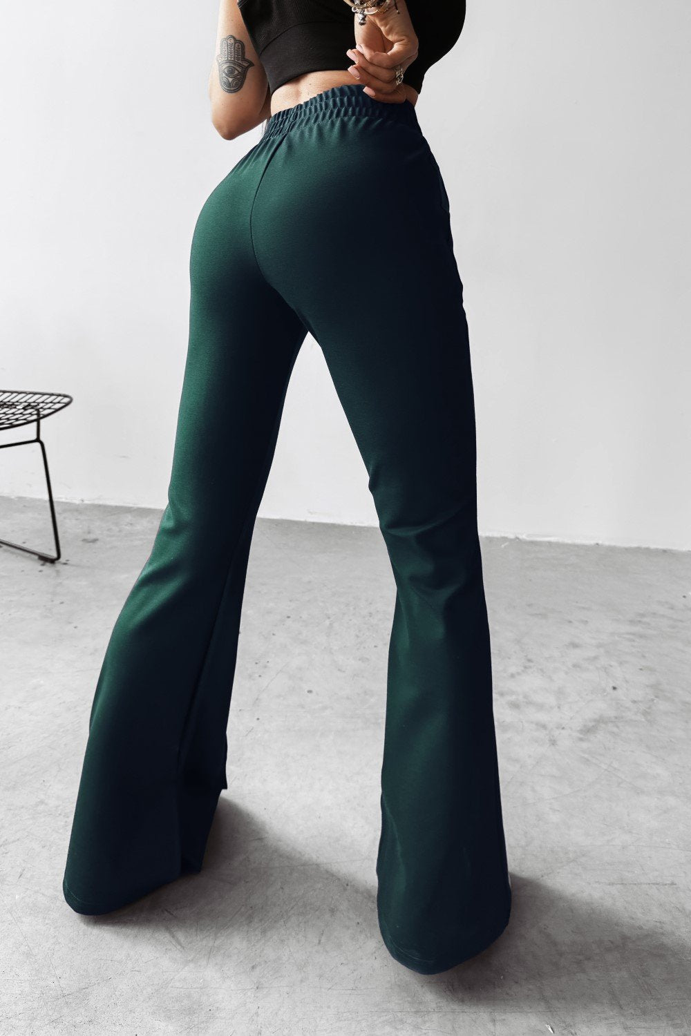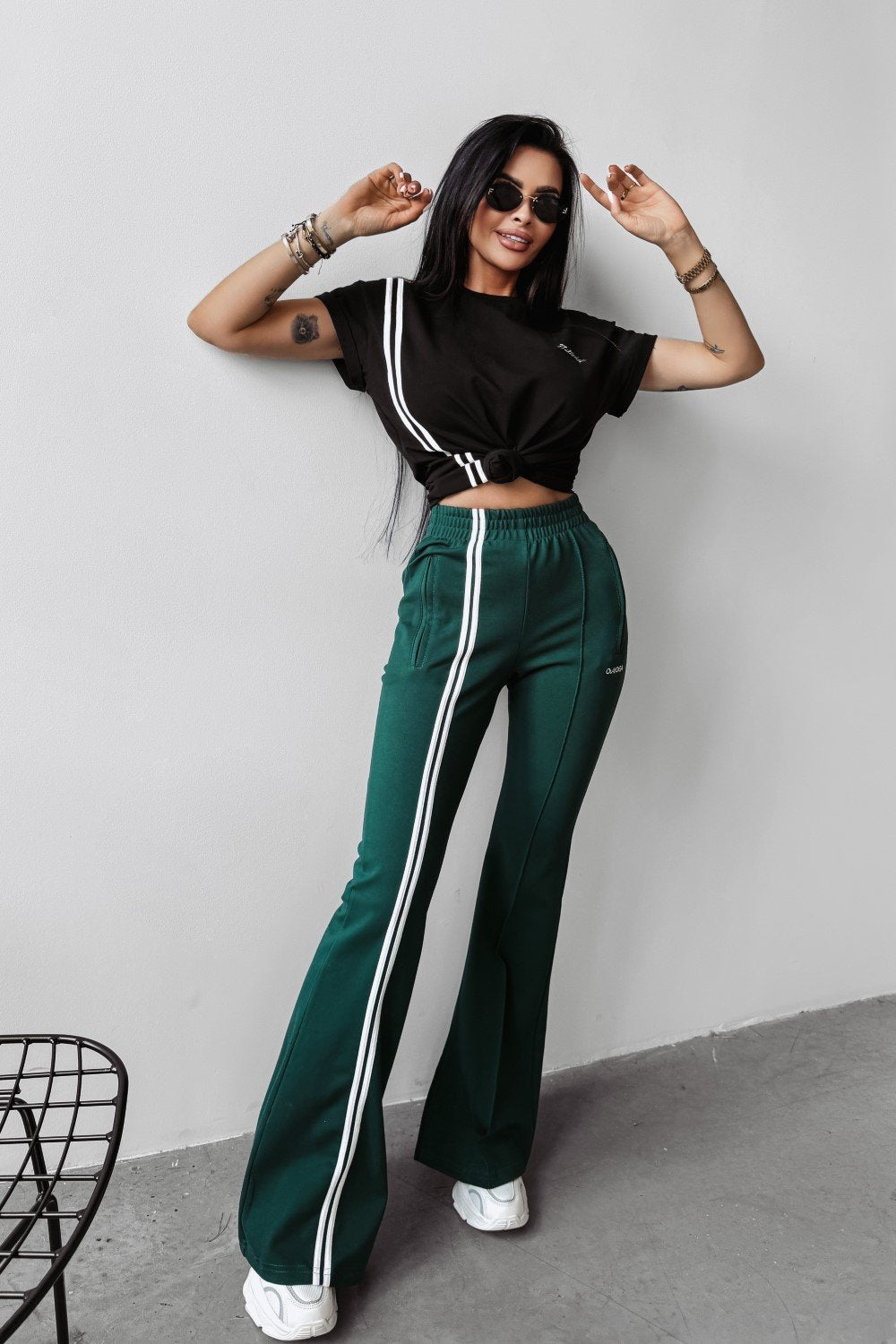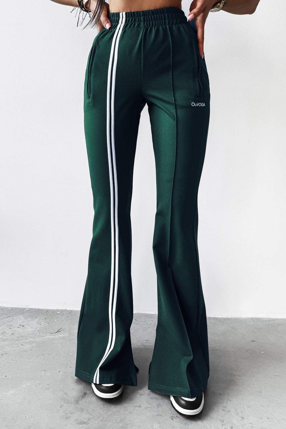Damenhose mit modischen Nähten und weitem Bein. Ein Bein ist mit einem Doppelstreifen verziert, und unten an der Hose befindet sich ein Innenschlitz. Die Taille ist elastisch, die OLIVE Das Logo erscheint mit minimalistischer Stickerei.