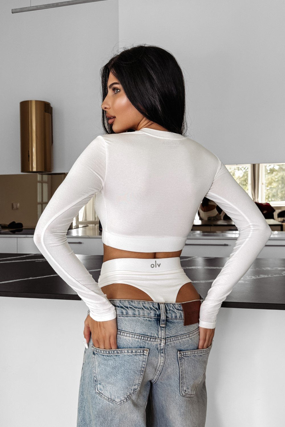 Das Oberteil ist ein kurzes Langarmshirt mit Gummizug in der Taille und einer dezenten „OLV“-Aufschrift auf der Vorderseite.