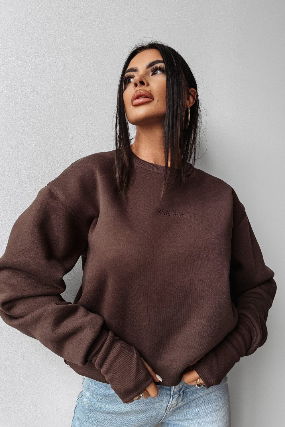 Gefütterter Oversize-Pullover mit längerer Länge aus hochwertiger Baumwolle. Mit OLAVOGA-Logo auf der Vorderseite, Daumenlöchern an den Ärmeln und großem Logo-Print auf der Rückseite.