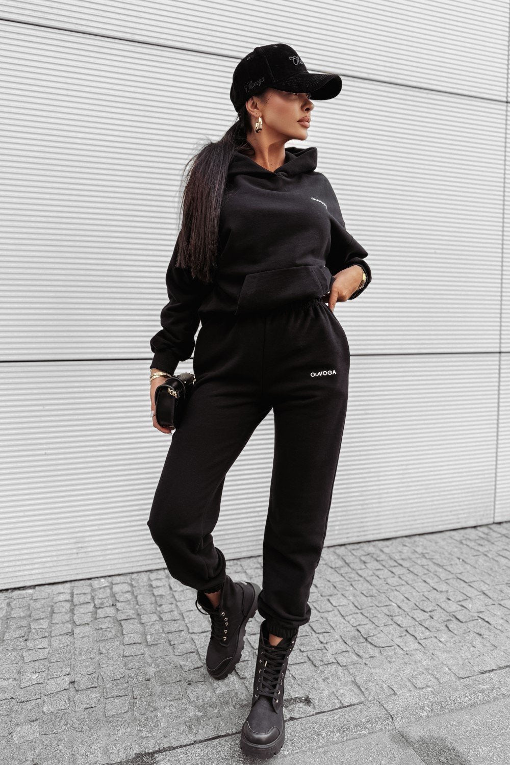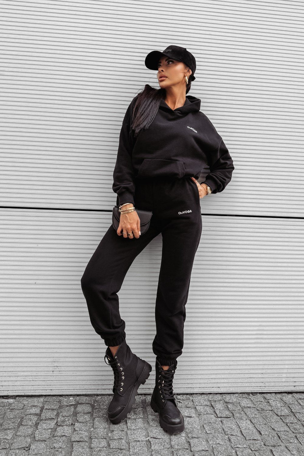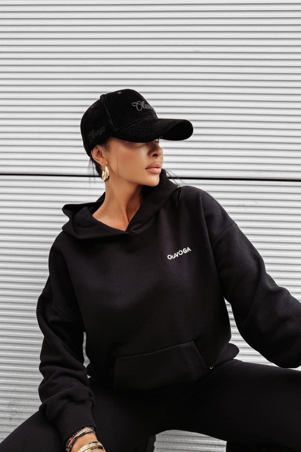 Der obere Teil ist ein übergroßer Pullover, mit geräumiger Kapuze und einer Kängurutasche, deren Vorderseite minimalistisches, kontrastreiches OLAVOGA-Logo schmückt.