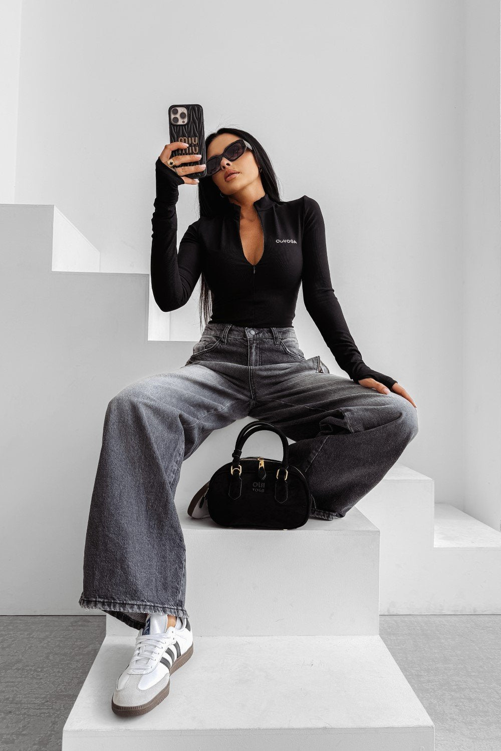 Sportlich-eleganter Body aus geripptem Material. Der taillierte Schnitt betont die Figur, mit Rollkragen und langen Ärmeln. Verziert mit einem dezenten Logo auf der Vorderseite, das schlichte Eleganz suggeriert.