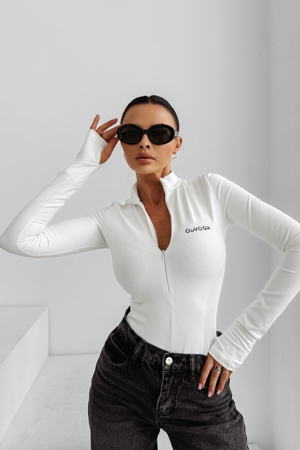 Sportlich-eleganter Body aus geripptem Material. Der taillierte Schnitt betont die Figur, mit Rollkragen und langen Ärmeln. Verziert mit einem dezenten Logo auf der Vorderseite, das schlichte Eleganz suggeriert.