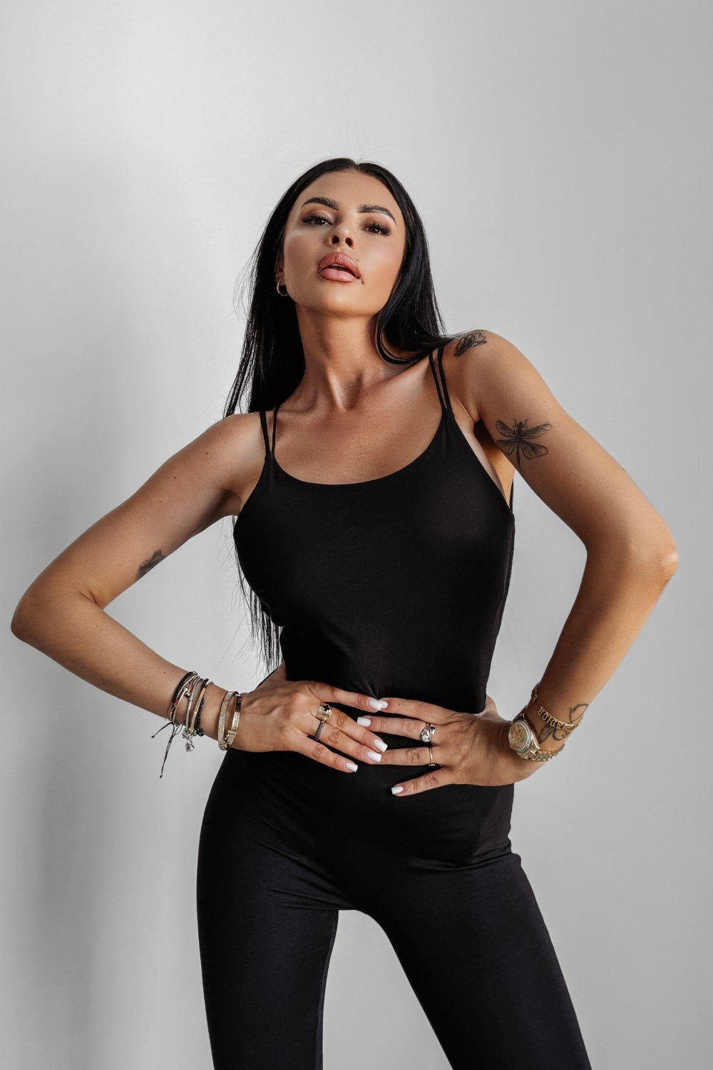 Perfekt sitzende Overalls mit dünnen Schultergurten und mit offener RückenlösungDas Modell aus hochwertigem, flexiblem Material aus Viskose, die für Komfort und einen eleganten Look sorgt. Vorderseite tiefes Dekolleté, zurück minimalistisches OLV-Logo.