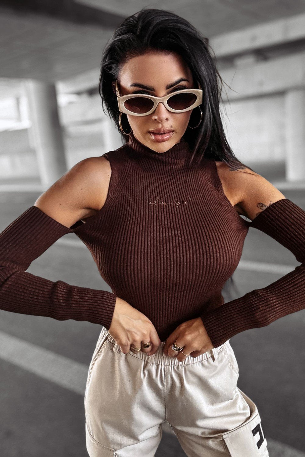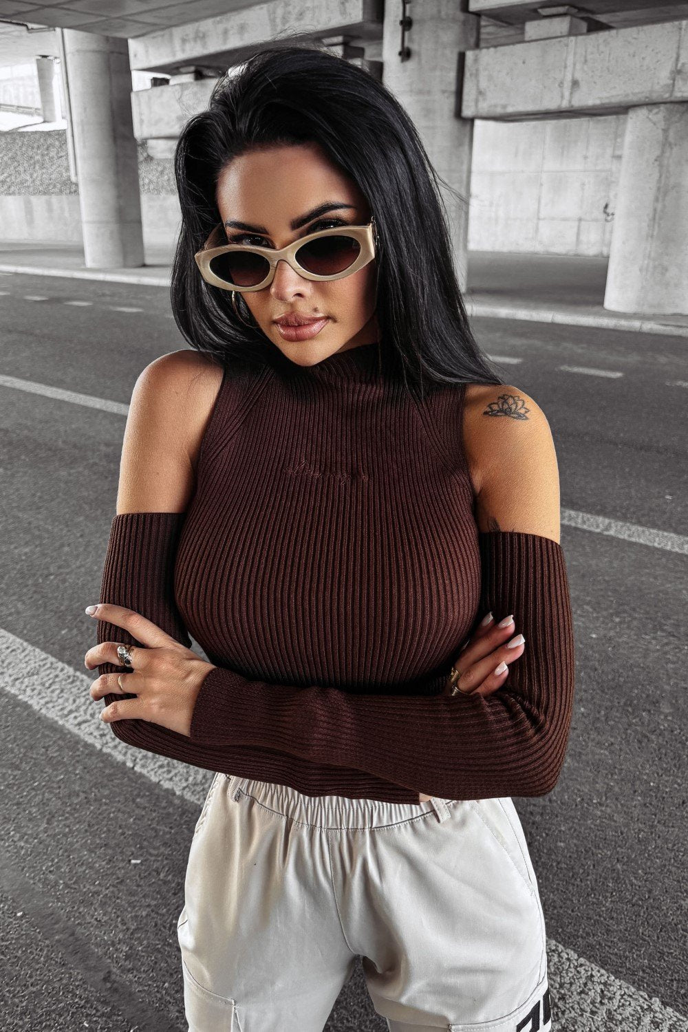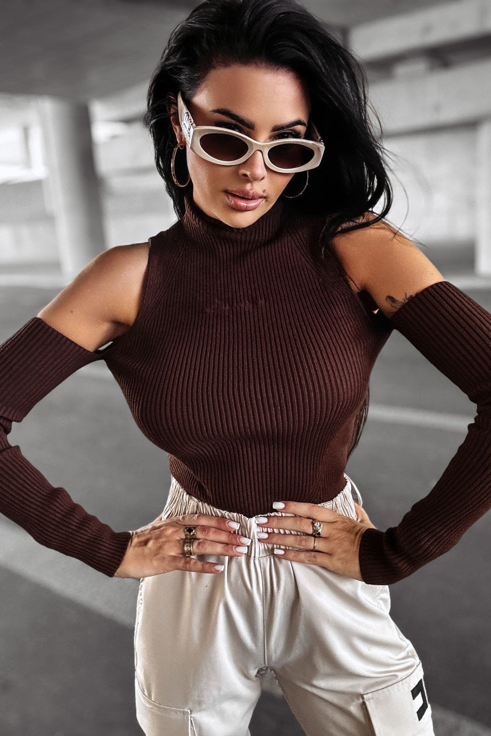 Langärmliges Damenoberteil mit schlichtem Schnitt. Die Schultern sind frei. Es hat einen geschlossenen Kragen. Es ist aus hochwertigem elastischem Material gefertigt. Auf der Vorderseite befindet sich ein minimalistisch gesticktes OLAVOGA-Logo.