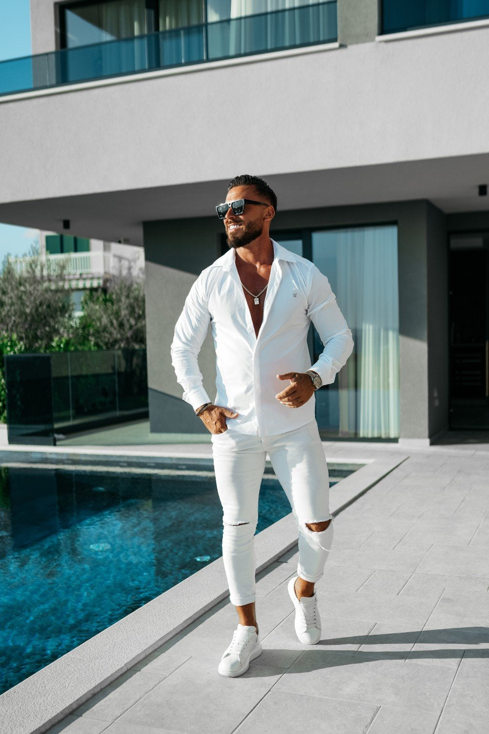 Klasszikus szabású, hosszú ujjú férfi ing, amely prémium minőségű, sima tapintású pamutból készült, enyhén rugalmas kialakítással a kényelmes viseletért. A modell diszkréten, rejtett gombolással záródik, klasszikus gallérral rendelkezik, és elegáns megjelenését a mellrészen elhelyezett minimalista aranyszínű logós embléma teszi teljessé.