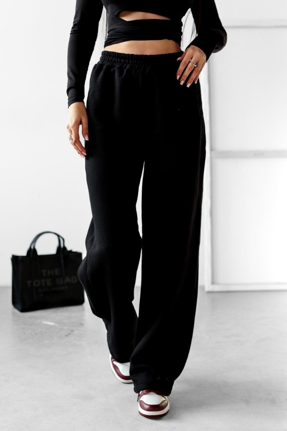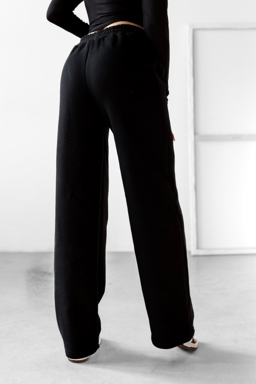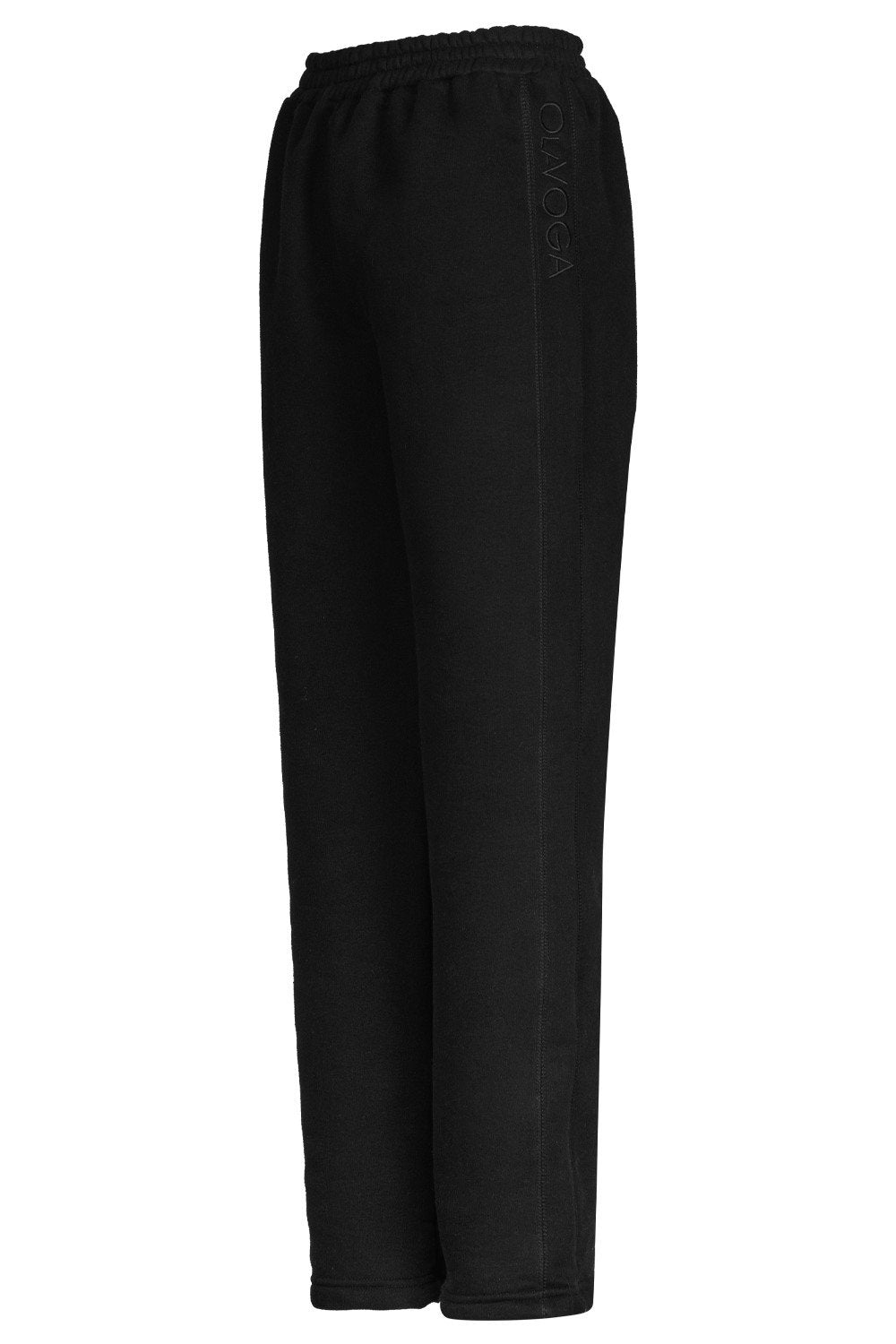 Sporthose für Damen. Hergestellt aus hochwertiger Baumwolle. Die Hosenbeine werden nach unten hin breiter. Elastischer Bund. Auf einem Bein befindet sich eine 3D-Stickerei mit dem Markenlogo von OLAVOGA.