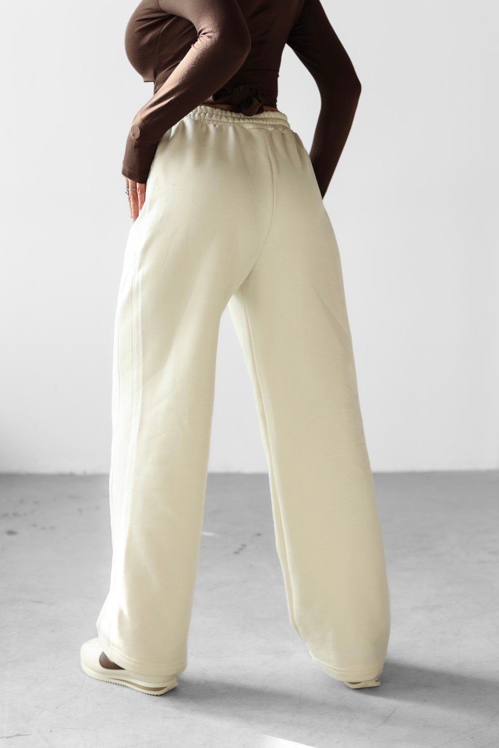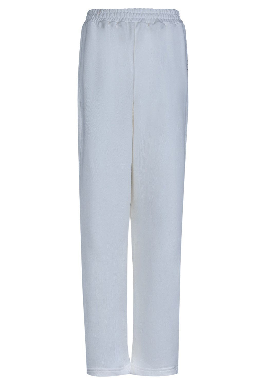 Sporthose für Damen. Hergestellt aus hochwertiger Baumwolle. Die Hosenbeine werden nach unten hin breiter. Elastischer Bund. Auf einem Bein befindet sich eine 3D-Stickerei mit dem Markenlogo von OLAVOGA.