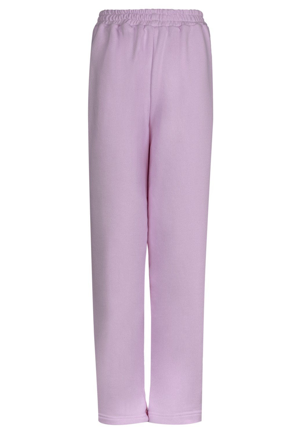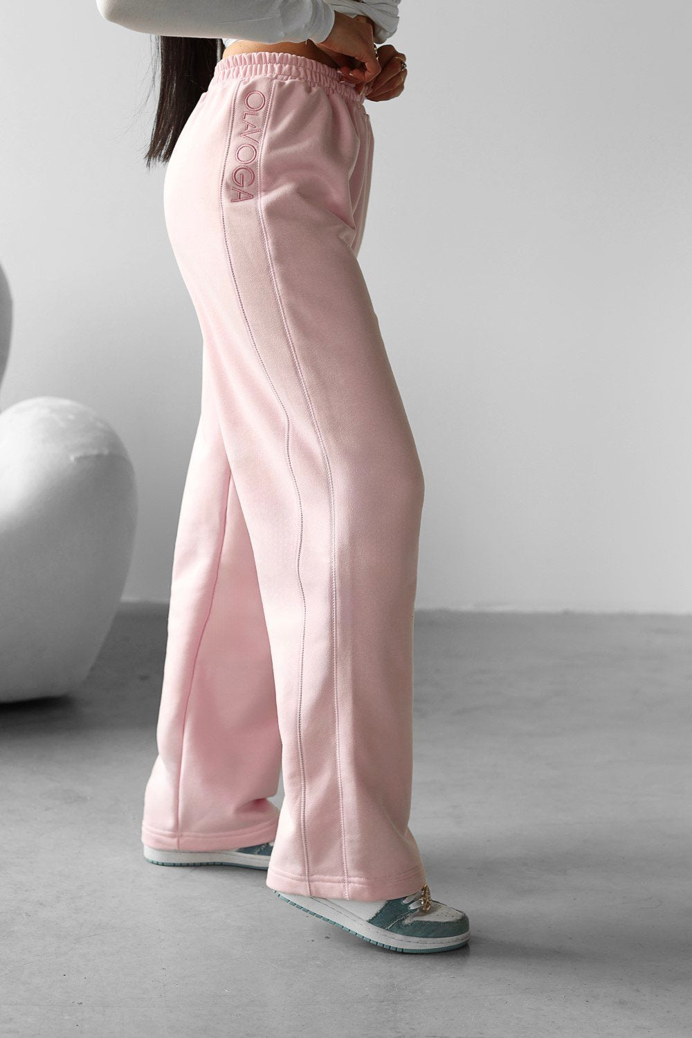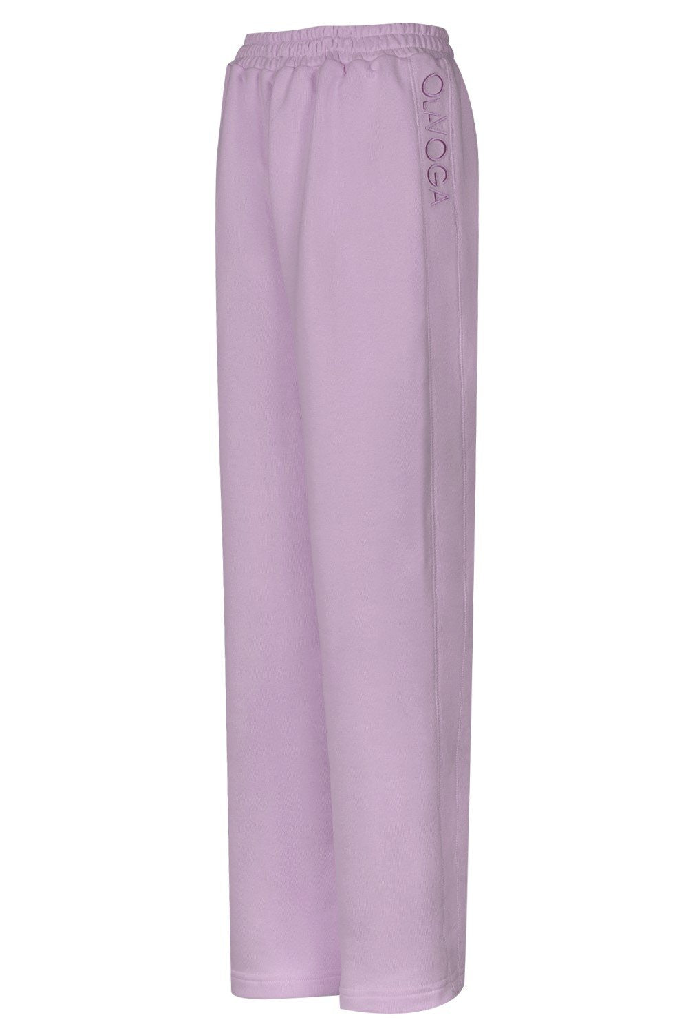 Sporthose für Damen. Hergestellt aus hochwertiger Baumwolle. Die Hosenbeine werden nach unten hin breiter. Elastischer Bund. Auf einem Bein befindet sich eine 3D-Stickerei mit dem Markenlogo von OLAVOGA.