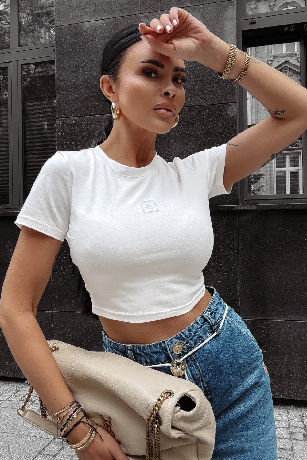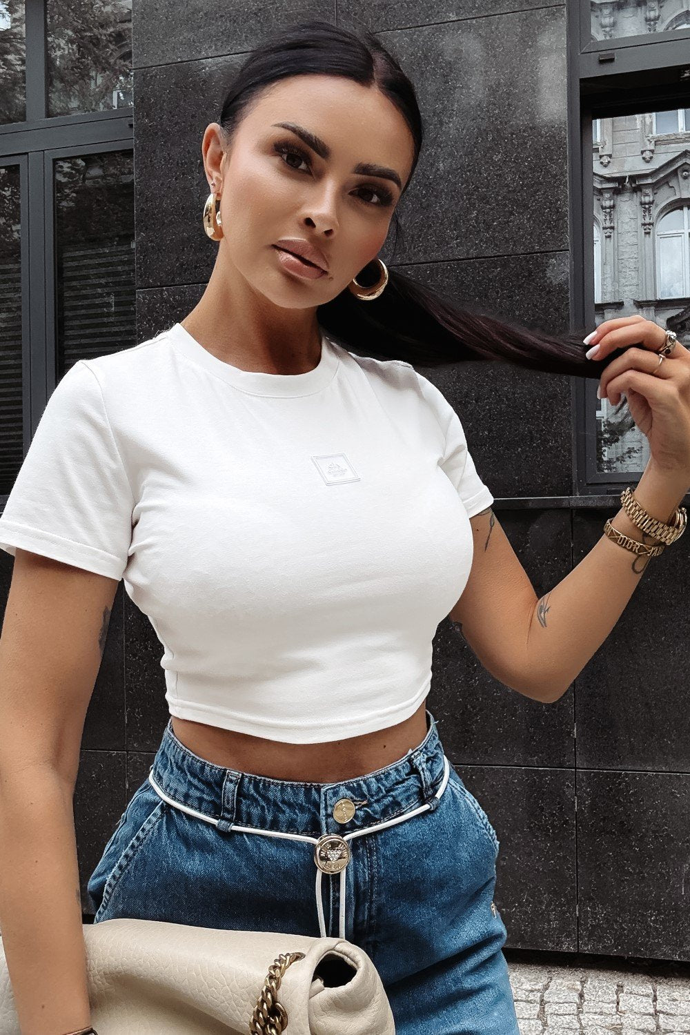 Crop Top mit kurzen Ärmeln und schmaler Passform. Aus hochwertiger, elastischer Baumwolle. Kontrastierende Grafik auf der Vorderseite und kleines Logo auf der Rückseite. Ideal zu Hosen oder Röcken.
