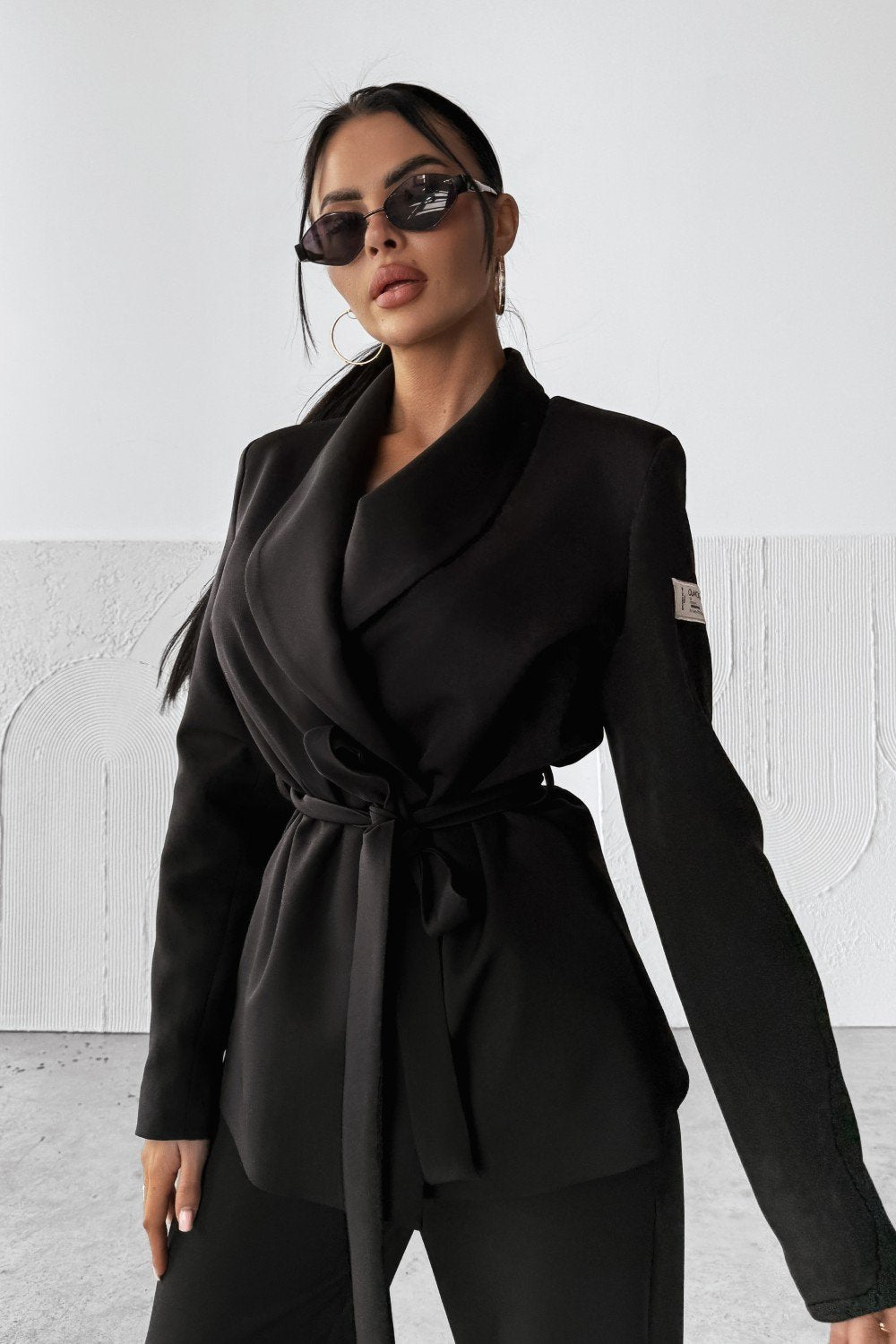 Obere: Klassische Slim-Fit-Jacke mit Bindeband in der Taille. Gepolsterte Schultern unterstreichen die Eleganz. Verziert mit einem Logo-Patch auf einem Ärmel.