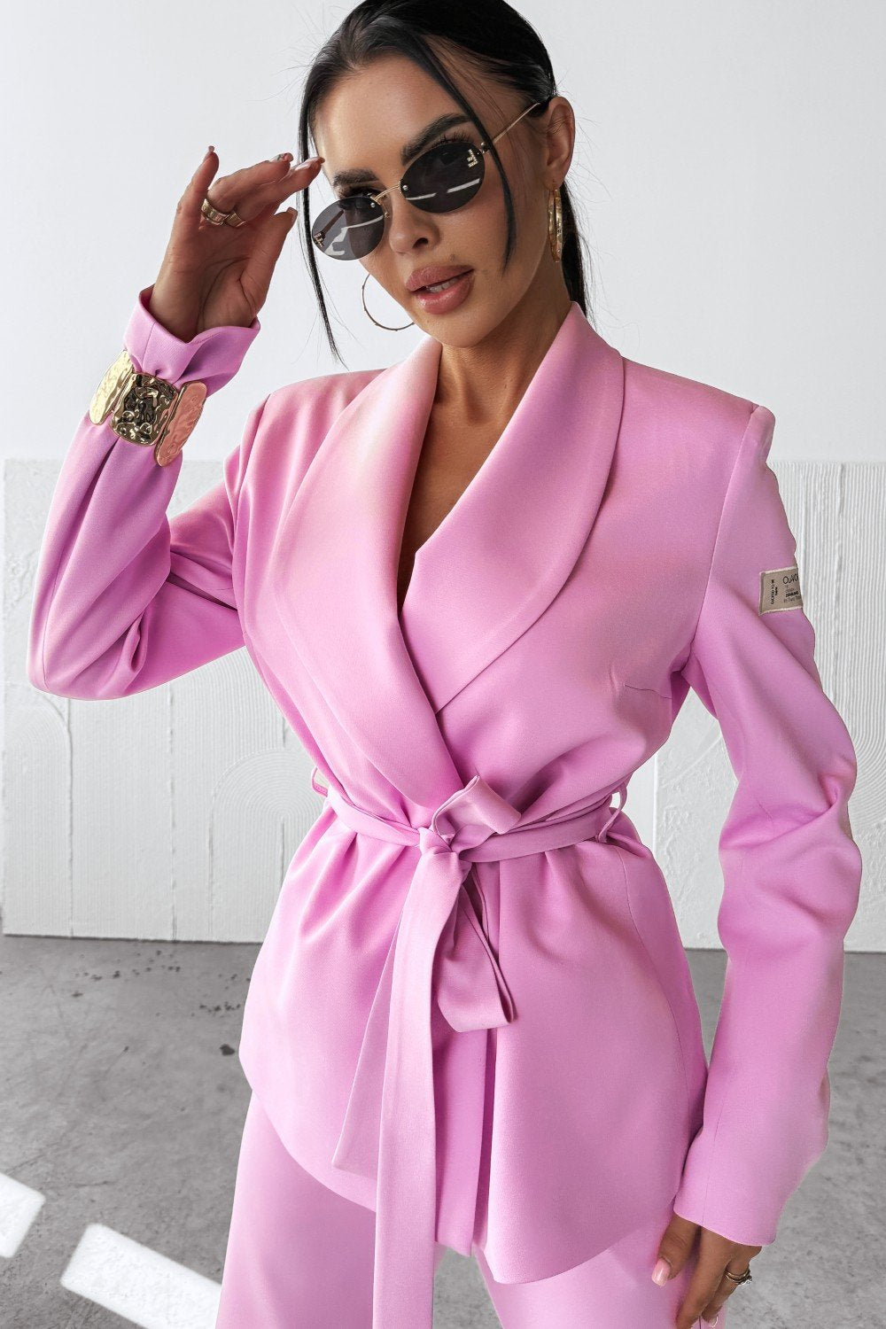 Obere: Klassische Slim-Fit-Jacke mit Bindeband in der Taille. Gepolsterte Schultern unterstreichen die Eleganz. Verziert mit einem Logo-Patch auf einem Ärmel.