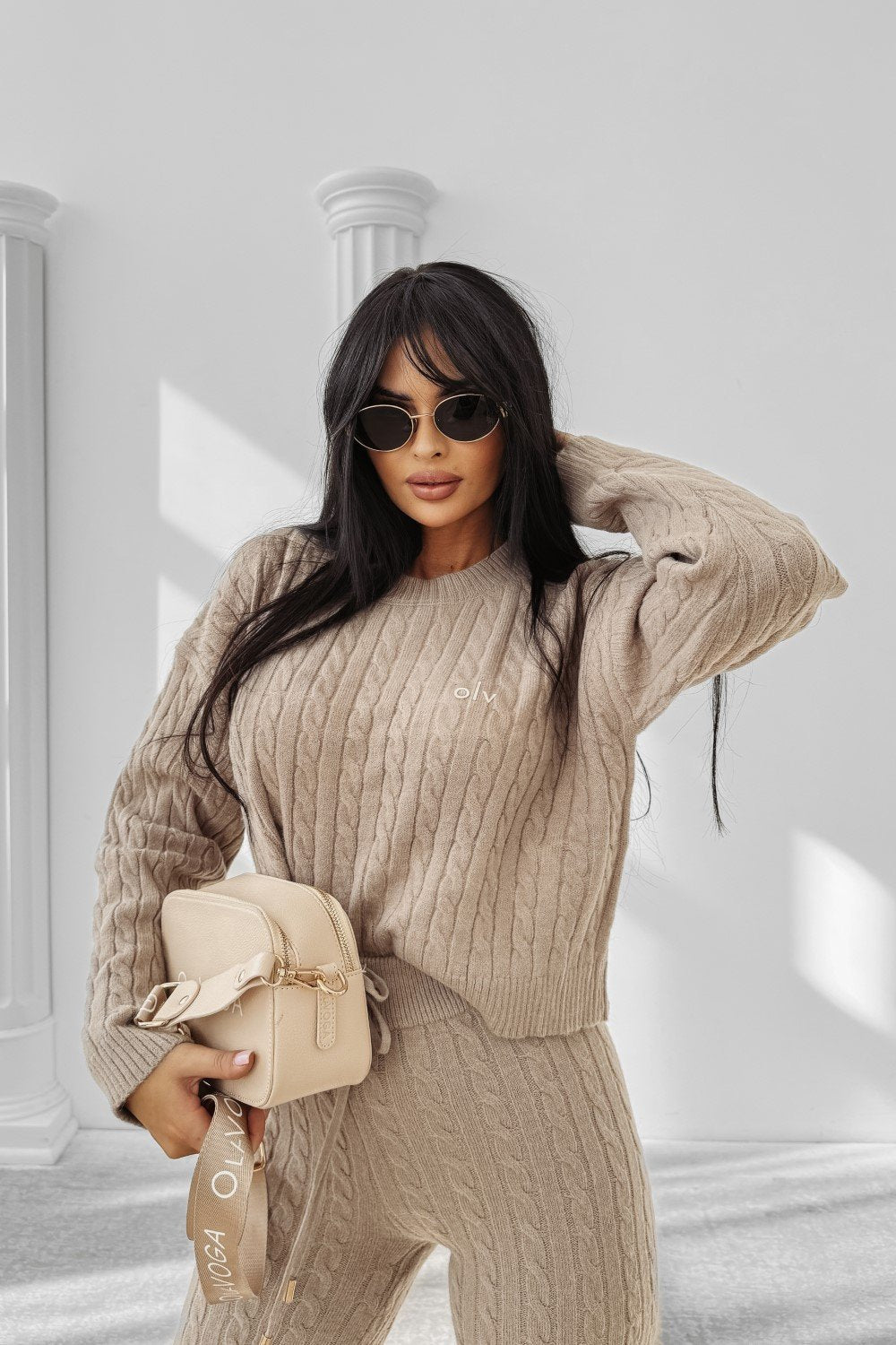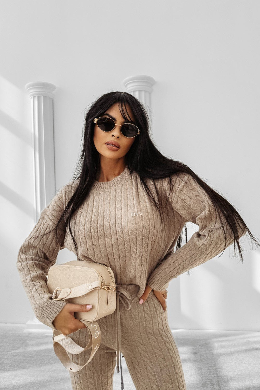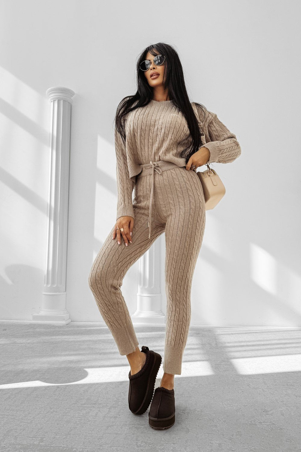 Bequemes Damen-Set aus weichem Strickstoff. Oberteil: Hoodie. Unterteil: Hose mit hoher Taille. Verziert mit einem Logo-Print auf der Vorderseite, der ihm einen sportlichen und modernen Charakter verleiht.