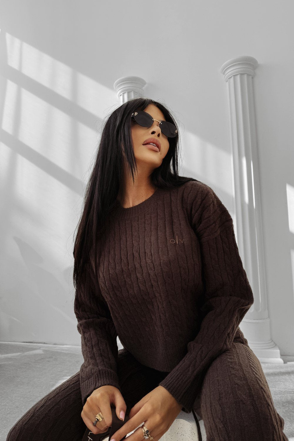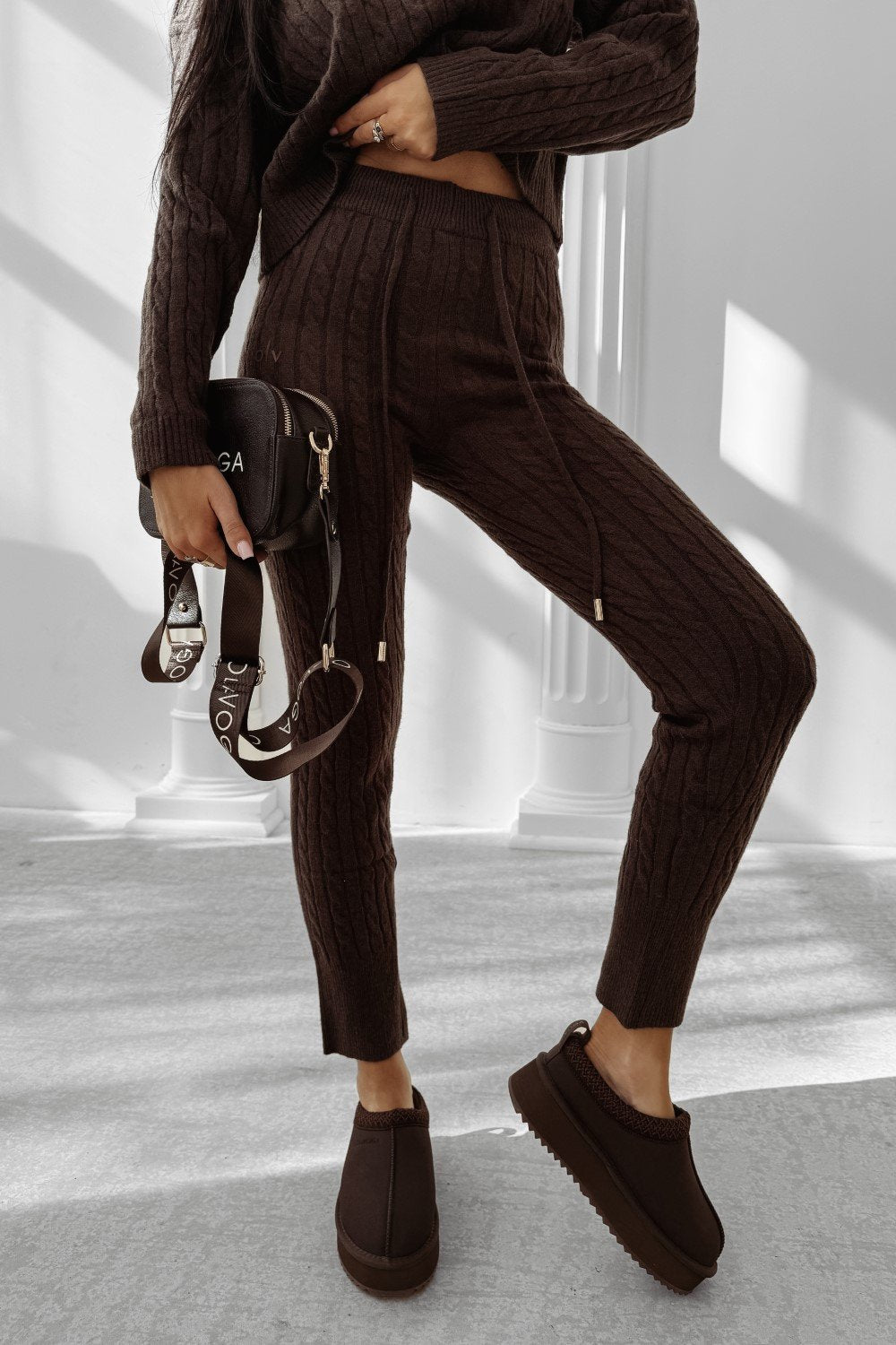 Bequemes Damen-Set aus weichem Strickstoff. Oberteil: Hoodie. Unterteil: Hose mit hoher Taille. Verziert mit einem Logo-Print auf der Vorderseite, der ihm einen sportlichen und modernen Charakter verleiht.