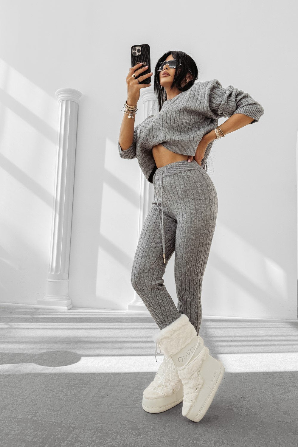 Bequemes Damen-Set aus weichem Strickstoff. Oberteil: Hoodie. Unterteil: Hose mit hoher Taille. Verziert mit einem Logo-Print auf der Vorderseite, der ihm einen sportlichen und modernen Charakter verleiht.