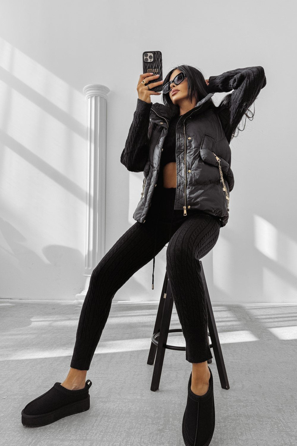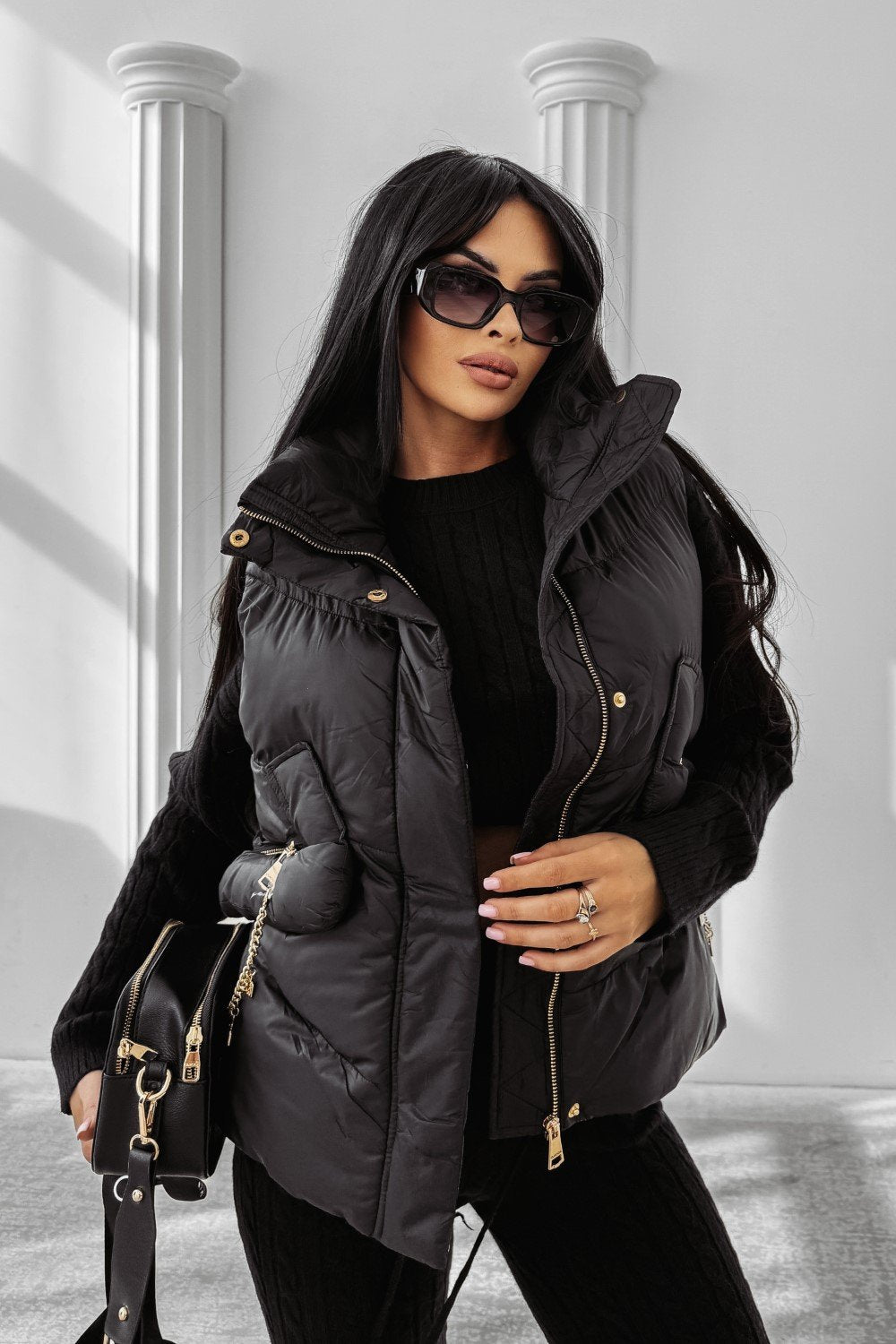 Oversize, steppelt mellény, amely kiválóan kombinálható pulóverrel vagy dzsekivel. Könnyű, mégis meleg anyagból készült. Cipzárral záródik, oldalt zsebekkel, elöl finom logóval.