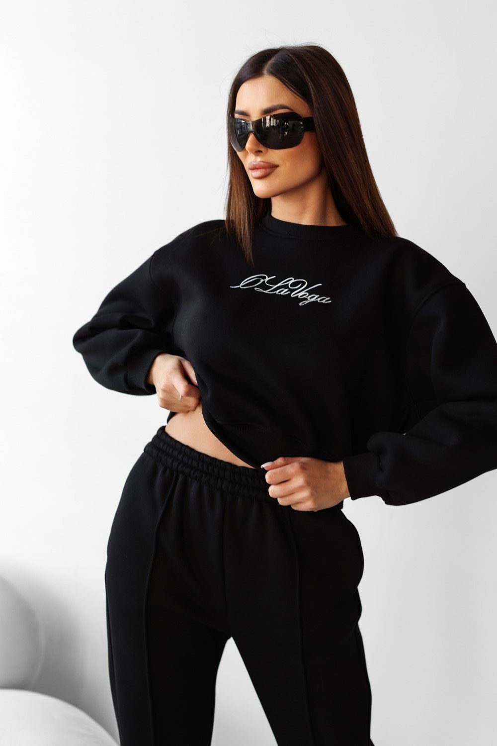 Oberteil - Damenpullover, etwas kürzer geschnitten. Rippbündchen an den Rändern. Große, schriftliche Stickerei mit dem Markenlogo von OLAVOGA auf der Vorderseite.