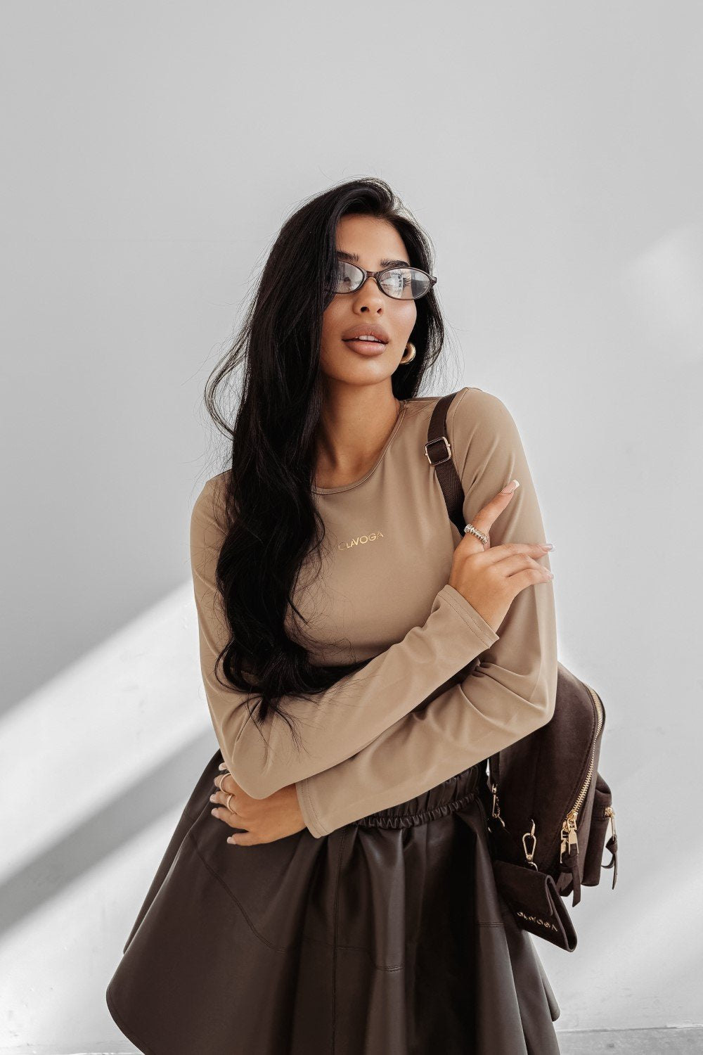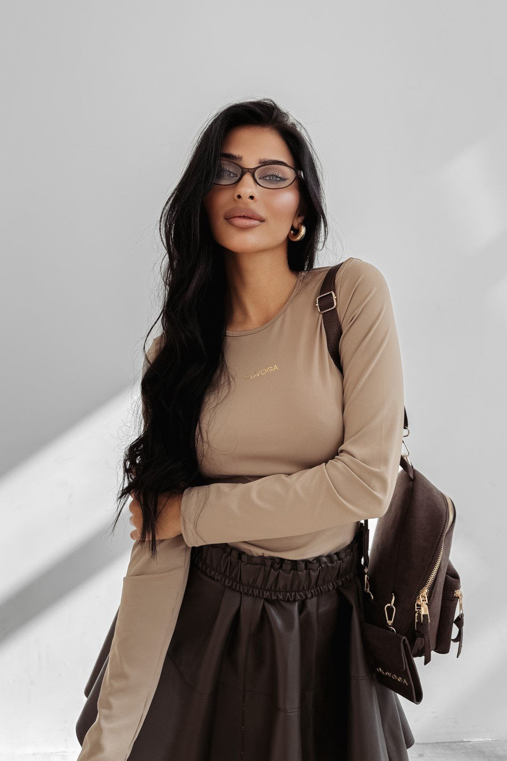 Minimalista, testhezálló hosszú ujjú felső, amely ideális mindennapi viselethez. Rugalmas anyagból készült, félgarbós nyakkal és diszkrét logóval a mellkason.