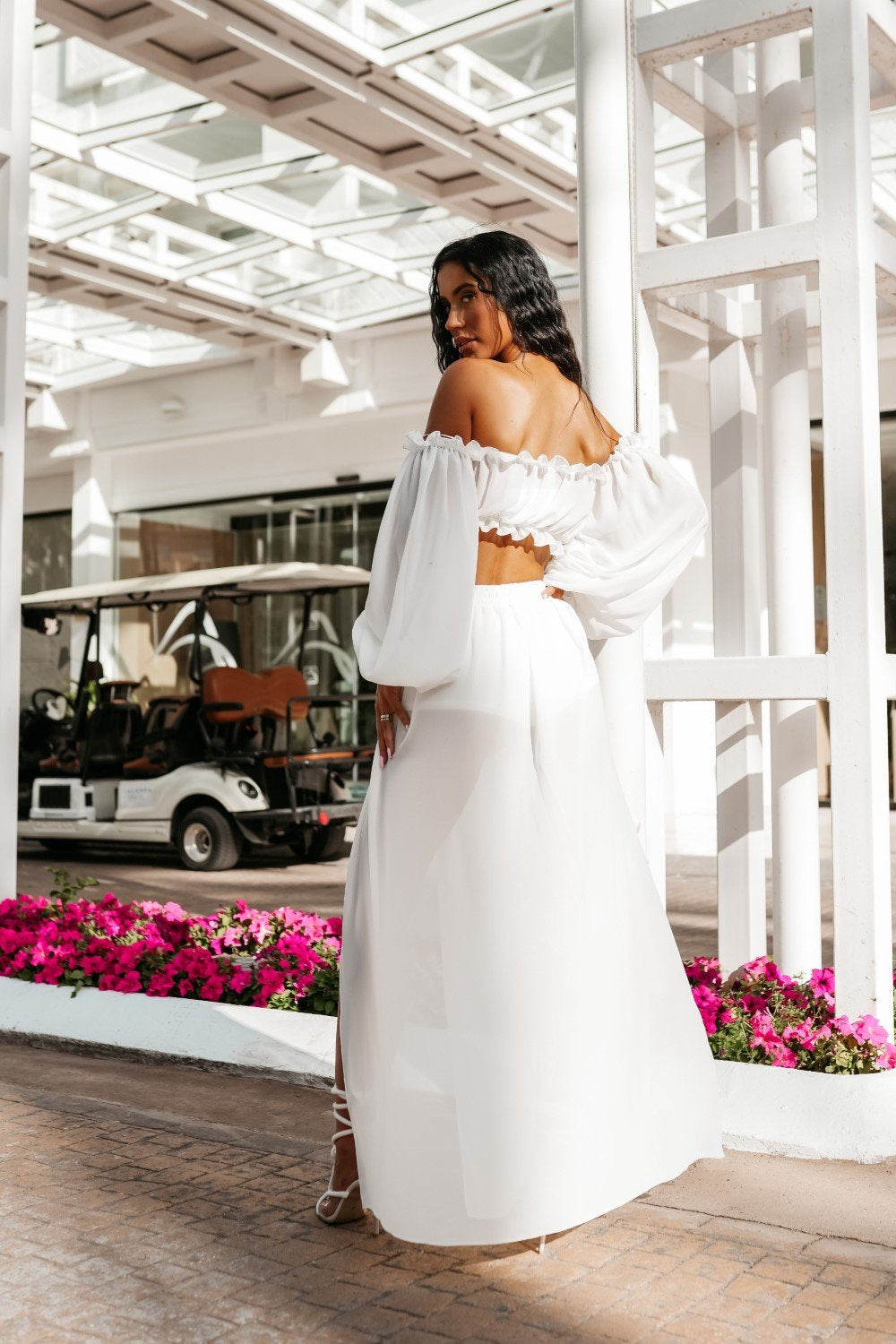 Látványos női szett könnyű, légáteresztő és félig áttetsző anyagból. A felsőrész egy rövid top spanyol nyakkivágással, fodros szegéllyel és rugalmas gumírozással, amely kényelmes illeszkedést biztosít. A maxi hosszúságú szoknya combközépig érő hasítékkal készült, kényelmes, gumis derékrésszel. A szoknya alatt beépített rövidnadrág található.