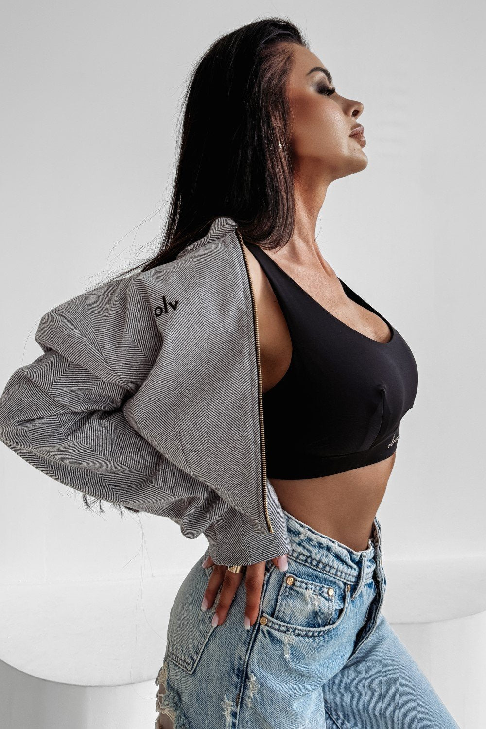 Casual stílusú, cipzáras női felső egyszerű szabással. Kiváló minőségű anyagból készült, viszkóz hozzáadásával, ami kellemes tapintást és komfortos viseletet biztosít. A felületet finom halszálkamintás textúra díszíti, míg az elülső részen visszafogott „OLV” felirat található.