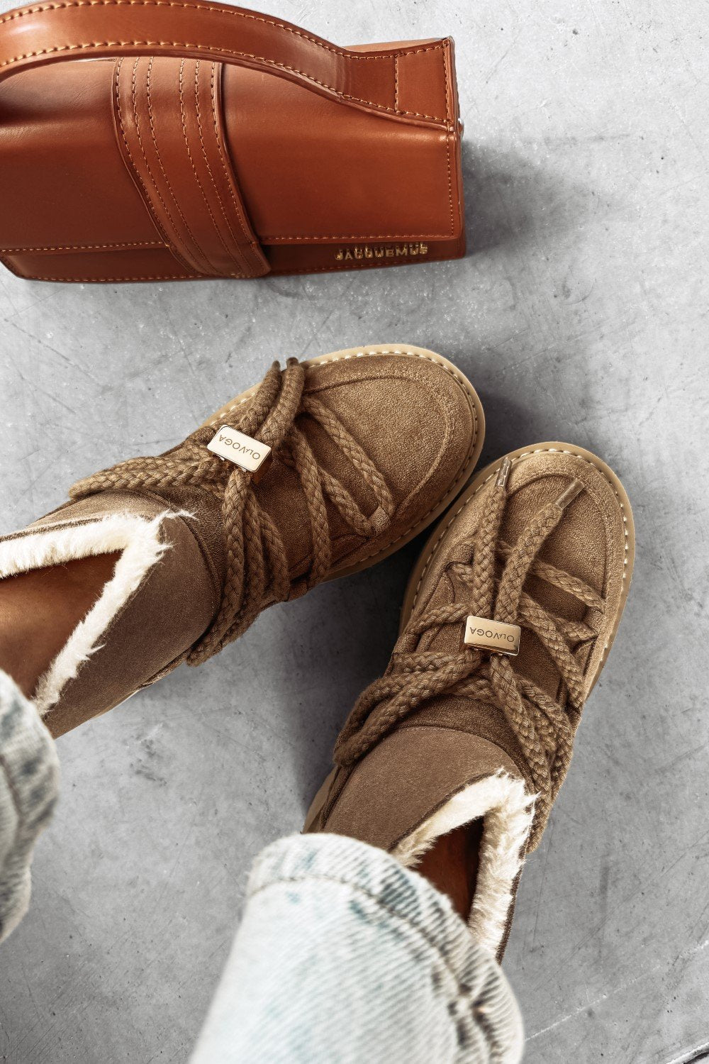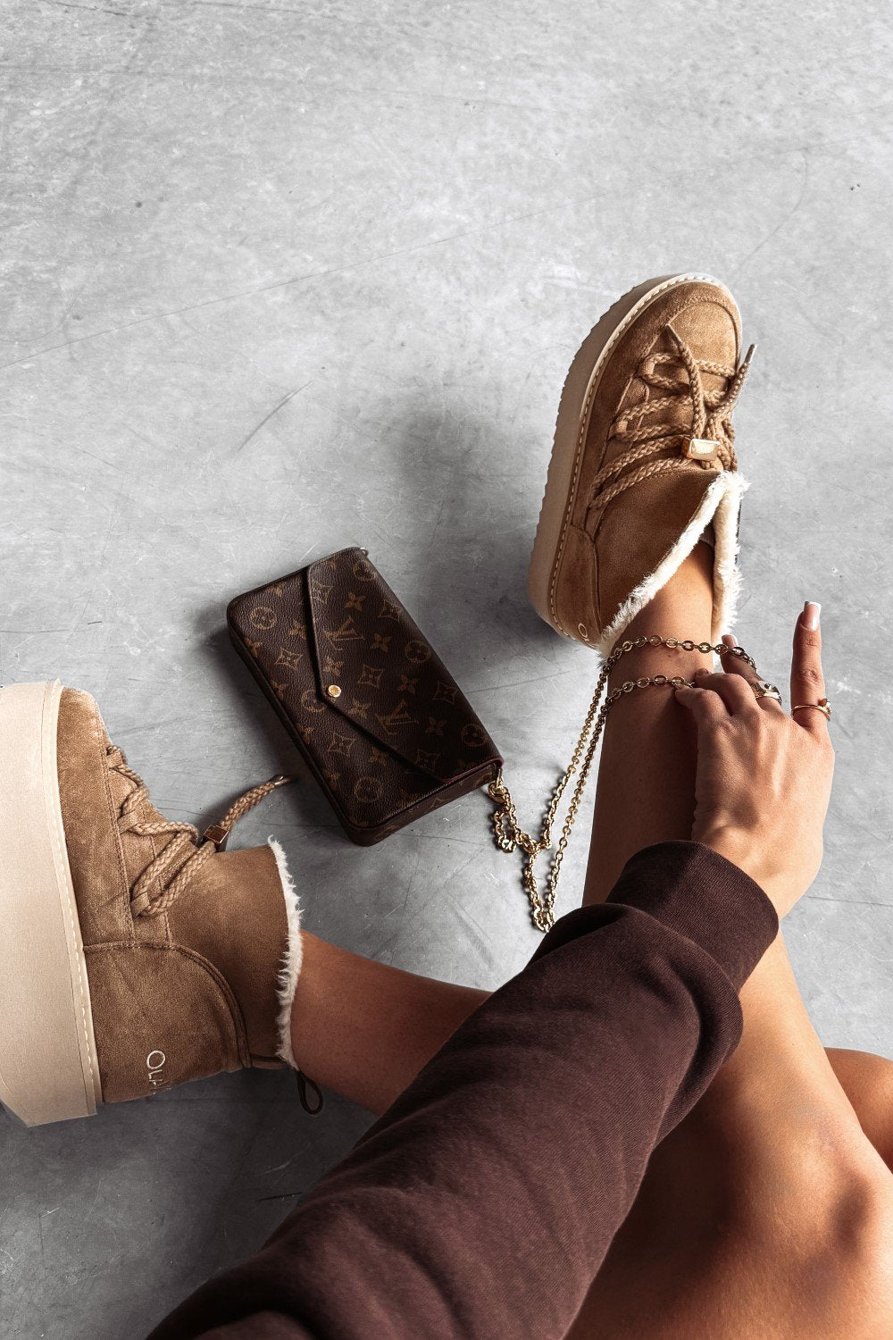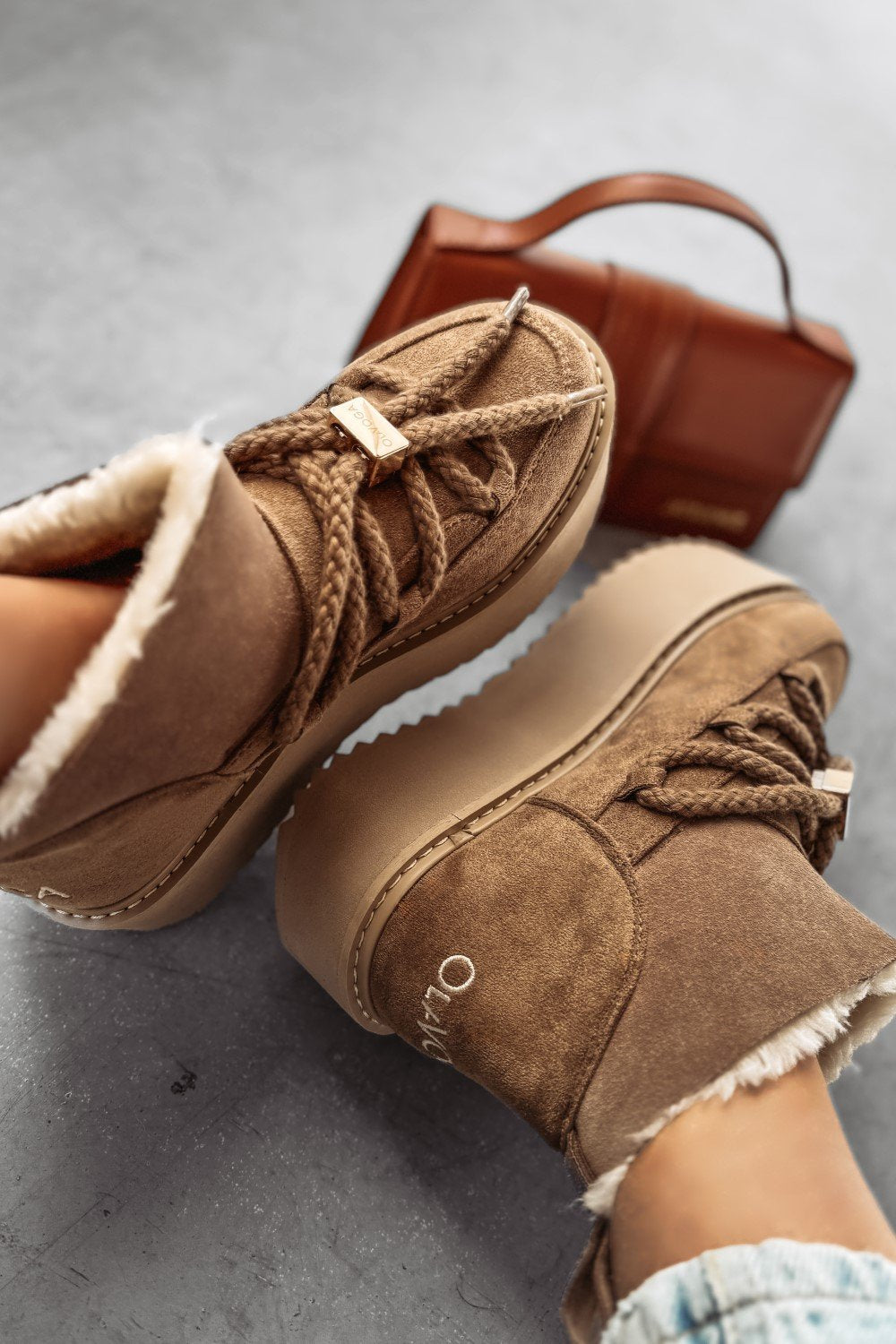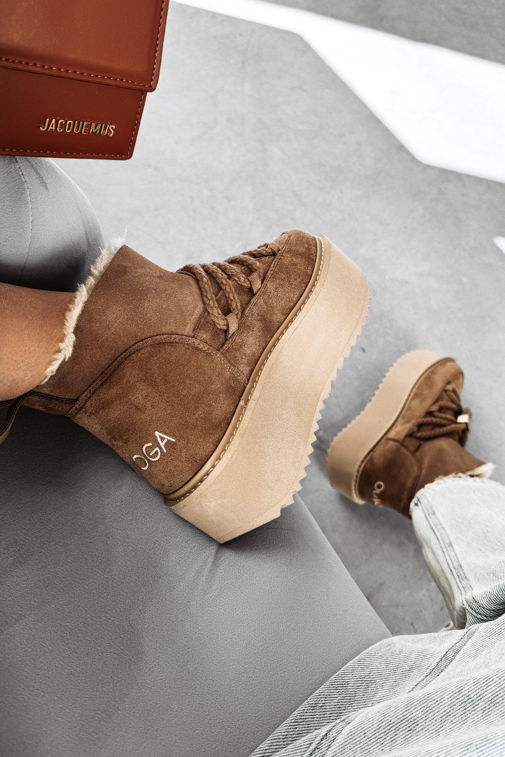 Bokáig érő, bőr női hócsizma. A hátulján a márka, az OLAVOGA hímzett logója található. A csizma belseje vastag, környezetbarát szőrmével van bélelve. A terméket vastagabb fűző díszíti. A csizmák masszív platformmal rendelkeznek, amely kiválóan csillapítja az ütéseket. A hócsizmák könnyűek, logózott, stílusos talppal.