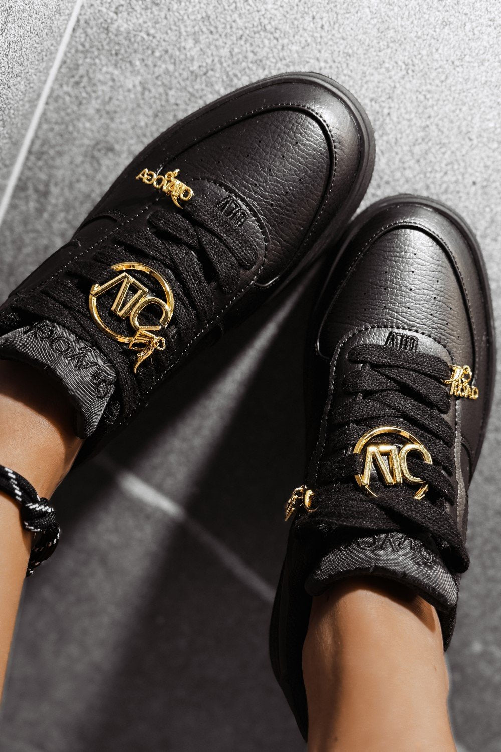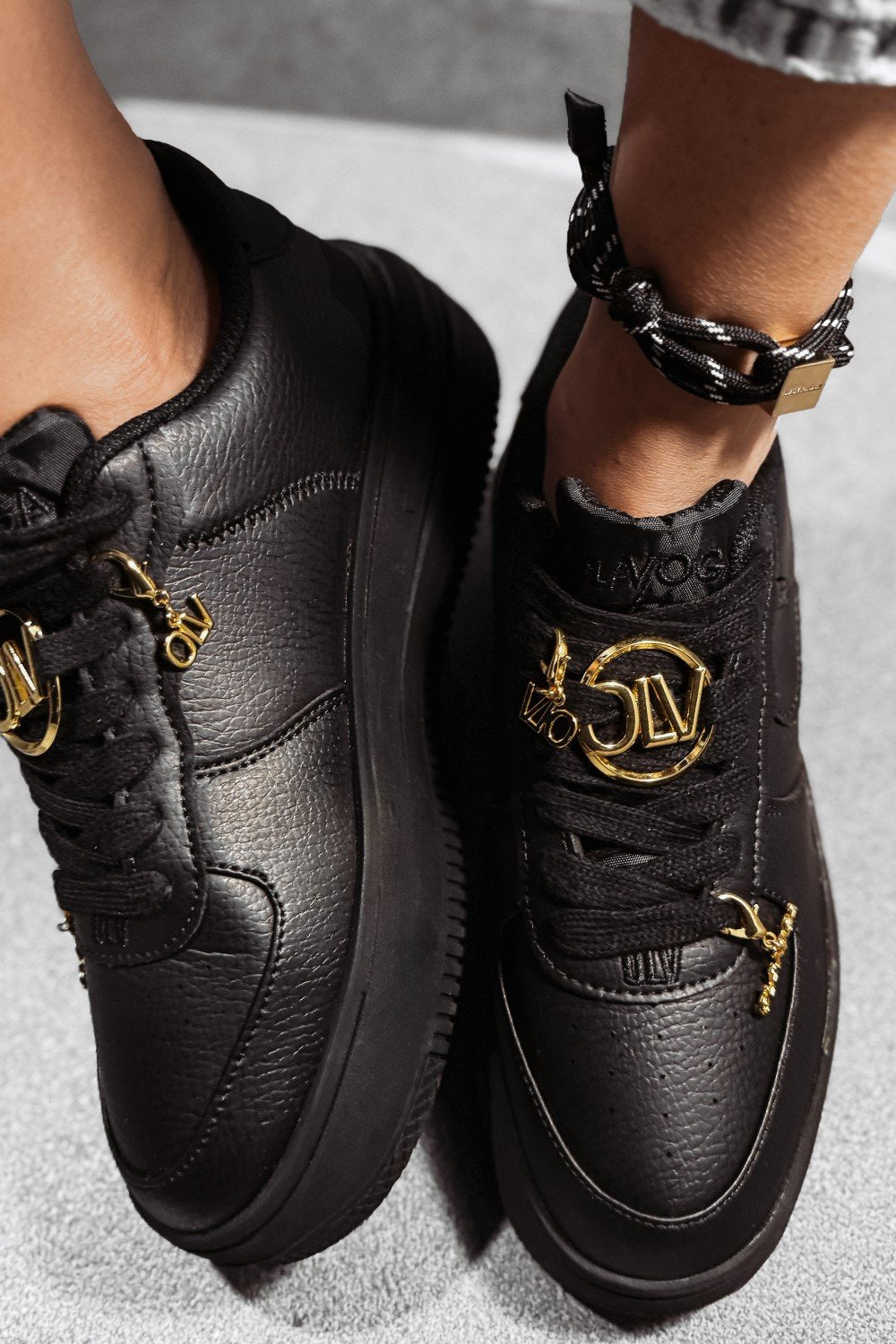 Sportos, masszív platformtalpú cipő, amely elegáns arany részletekkel van gazdagítva.