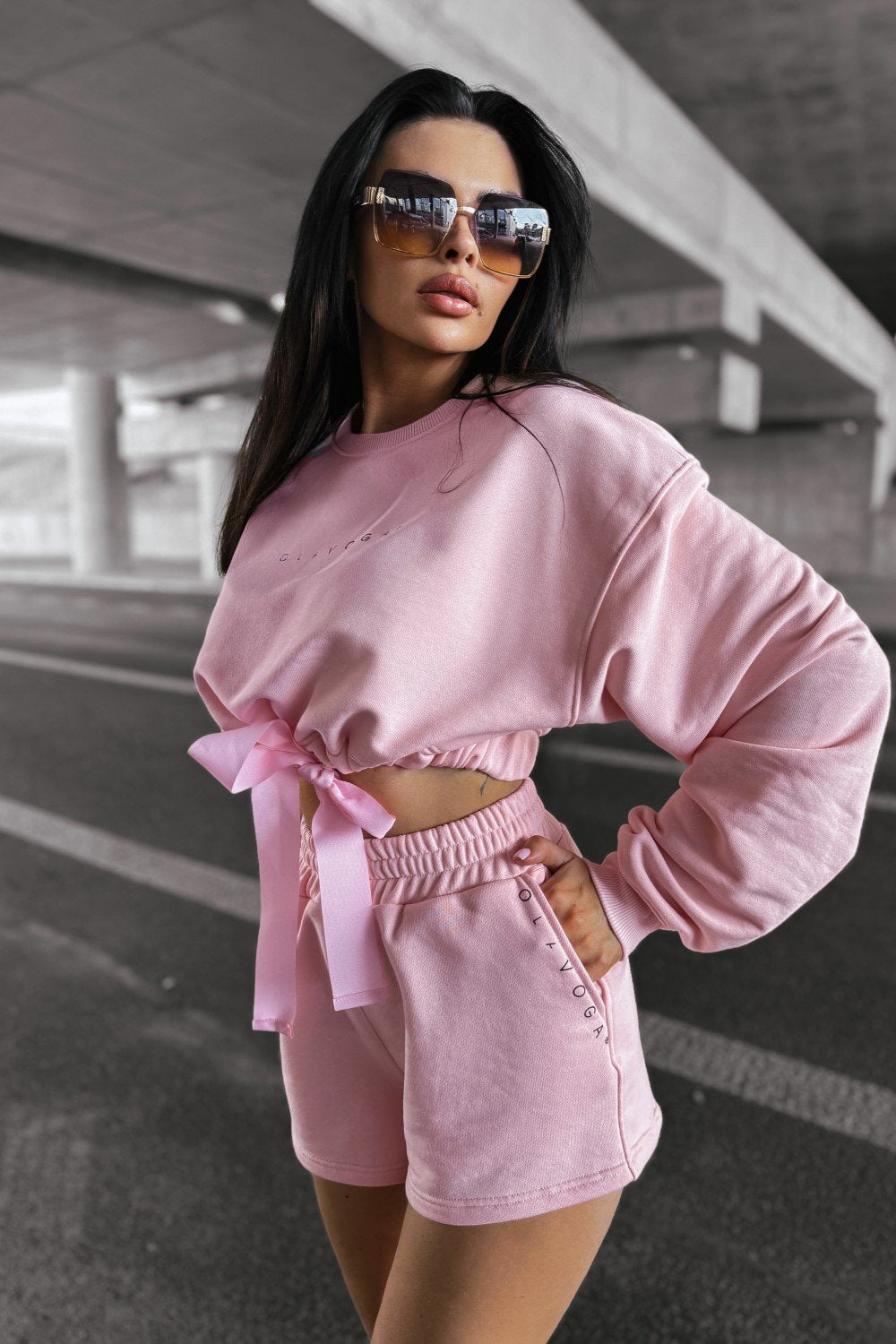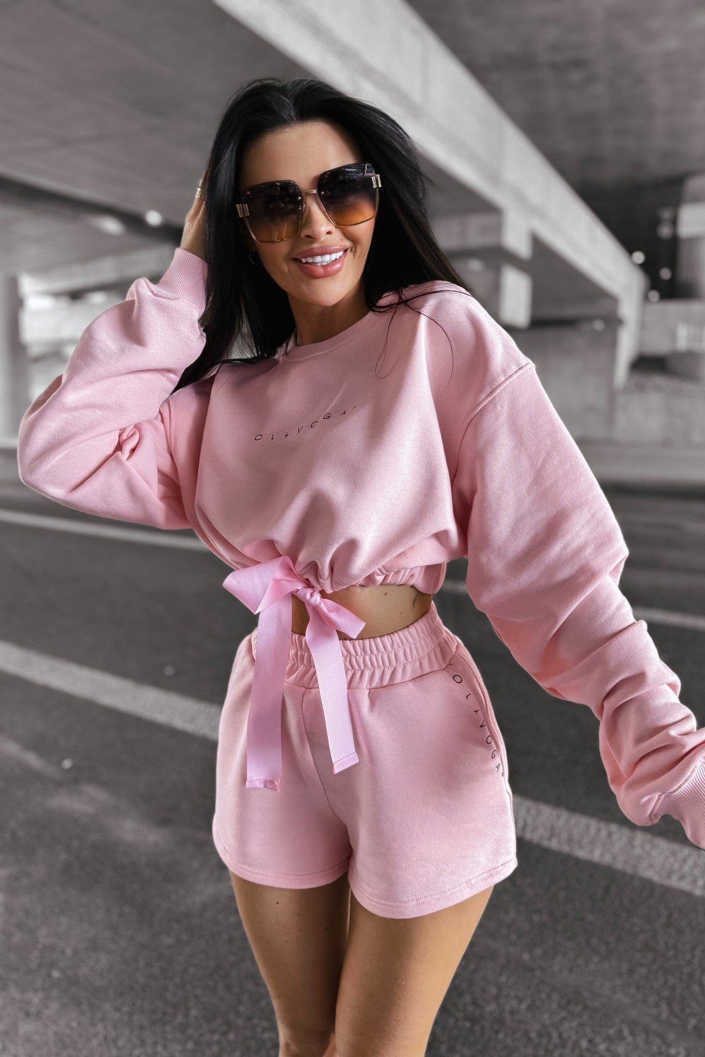 Felső: kapucni nélküli pulóver, bordázott passzékkal és húzózsinóros derékszabályozással. Az elülső részen OLAVOGA logóval díszítve.