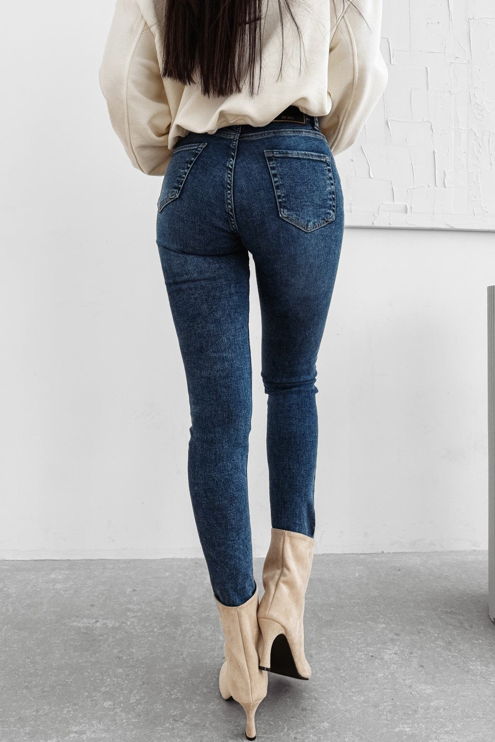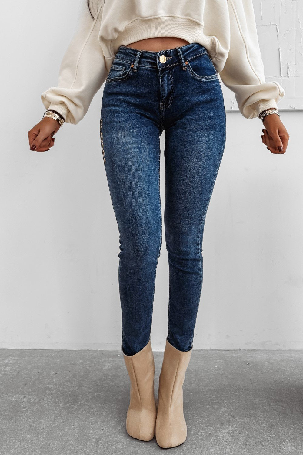 Spodnie dżinsowe casual o wysokim talii. Klasyczny design z pięcioma kieszeniami, zapinane na guzik i suwak. Wykonane z premium denimu, z logo z tyłu.