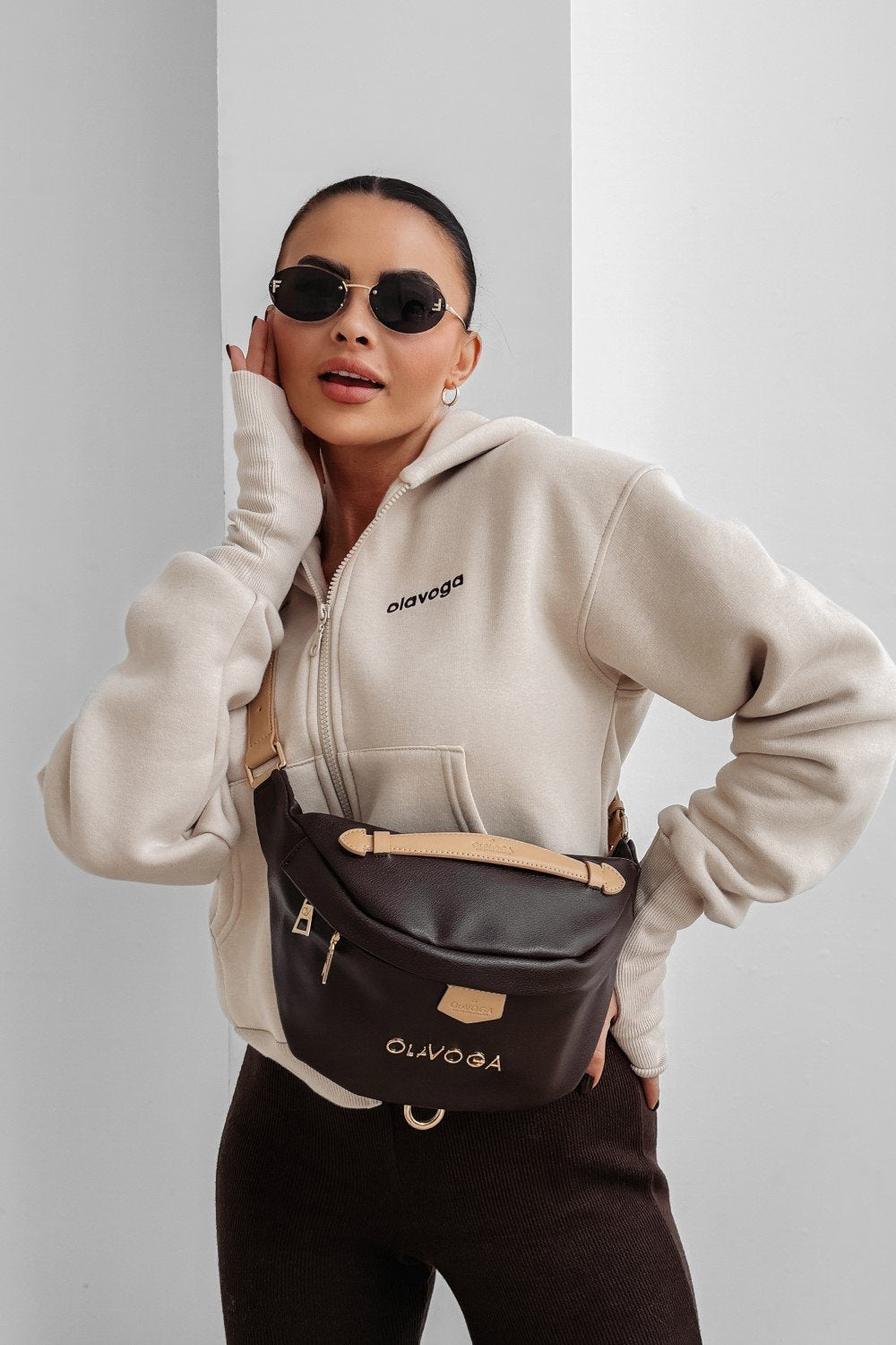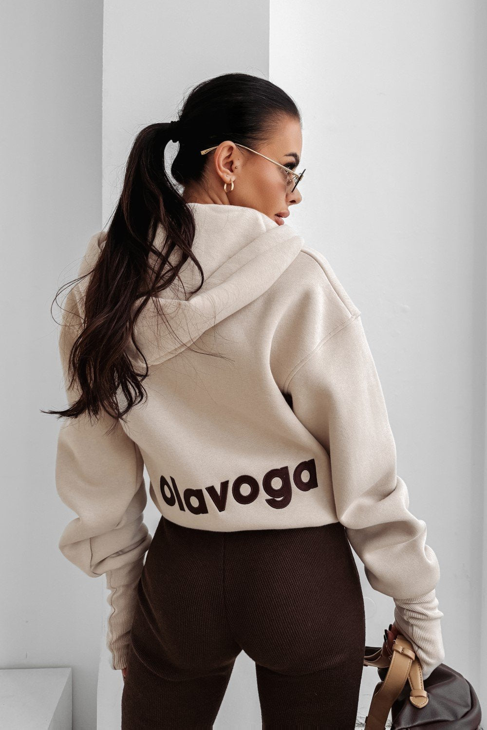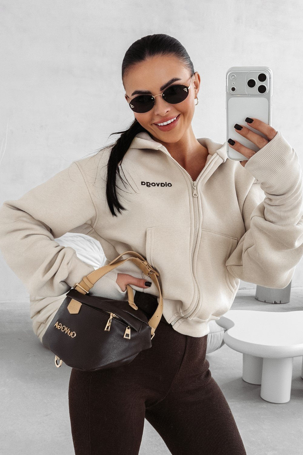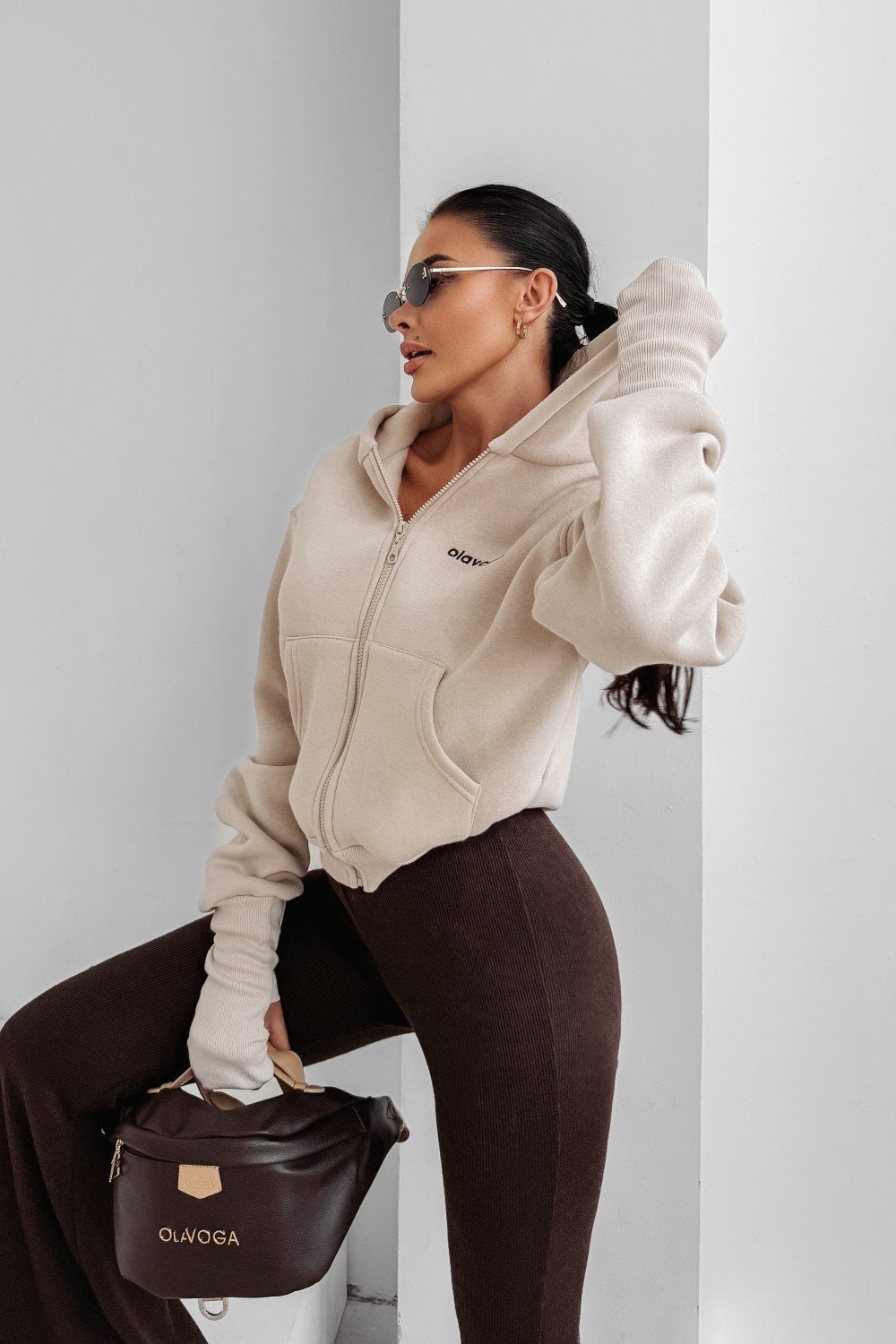 Enyhén oversize, rövidebb fazonú kapucnis pulóver. Puha dzsörzéből készült, cipzáras záródással. Elöl finom logó részlettel.