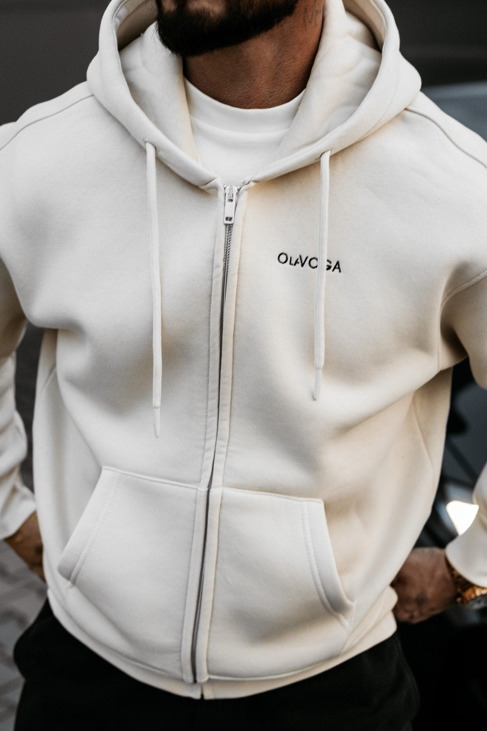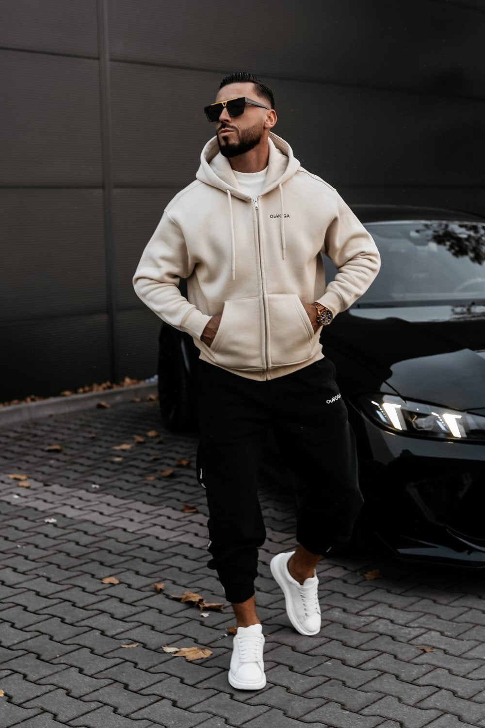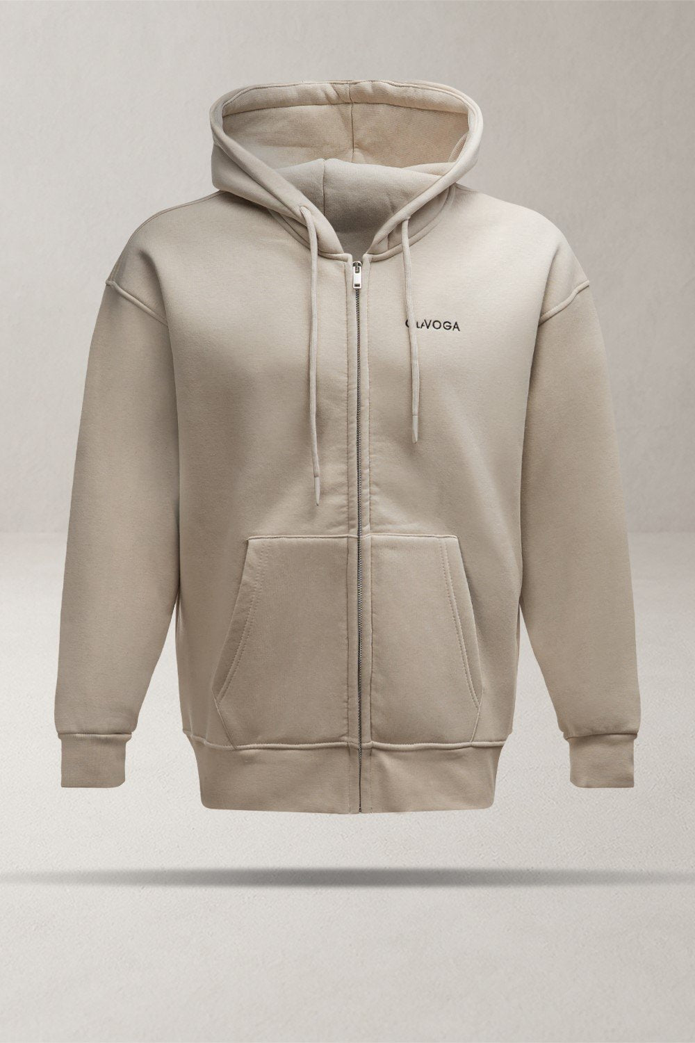 Férfi zip-up kapucnis pulóver minimalista fazonnal. Pamut alapanyag, elöl cipzár és kenguruzseb. Mellkason visszafogott logó.