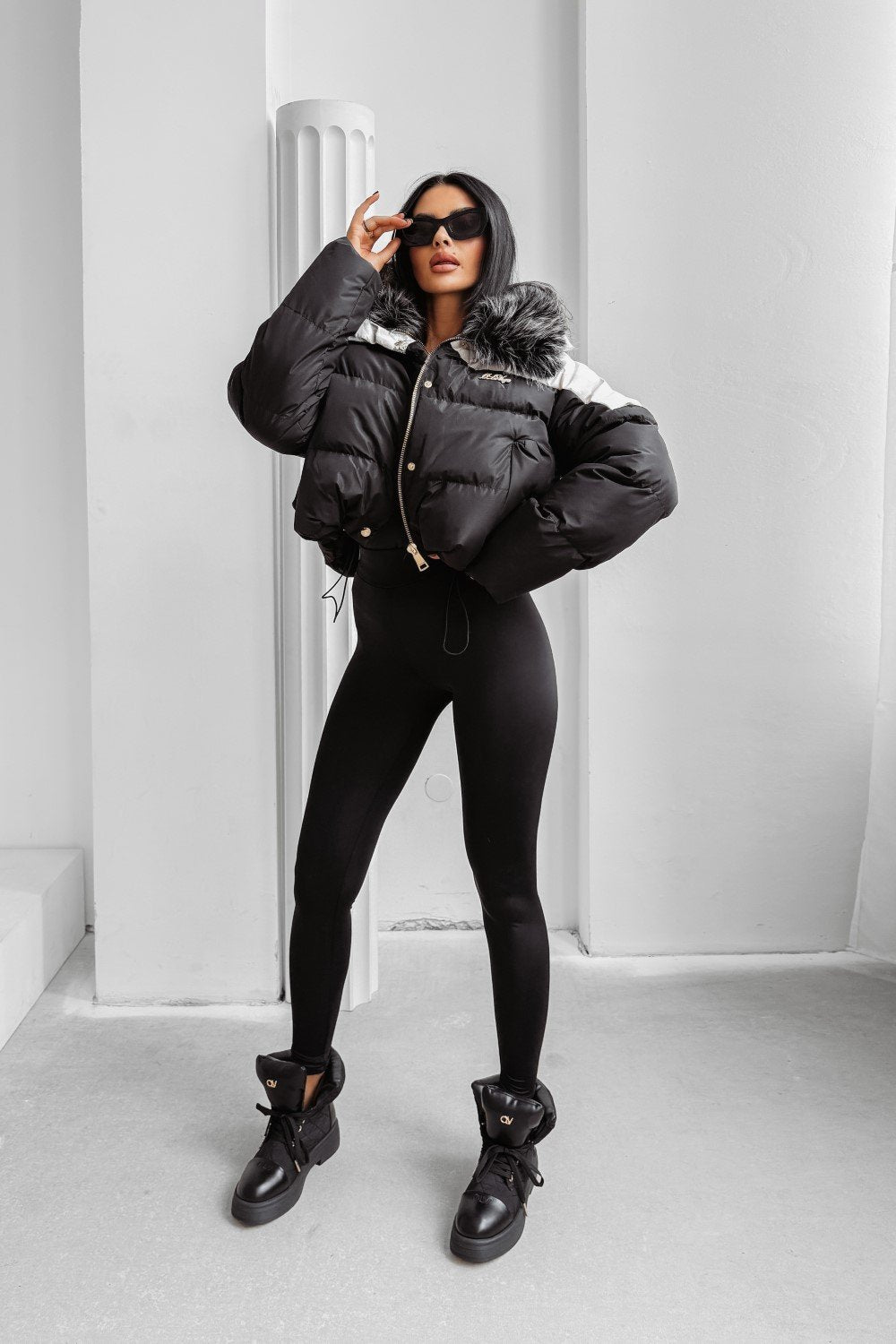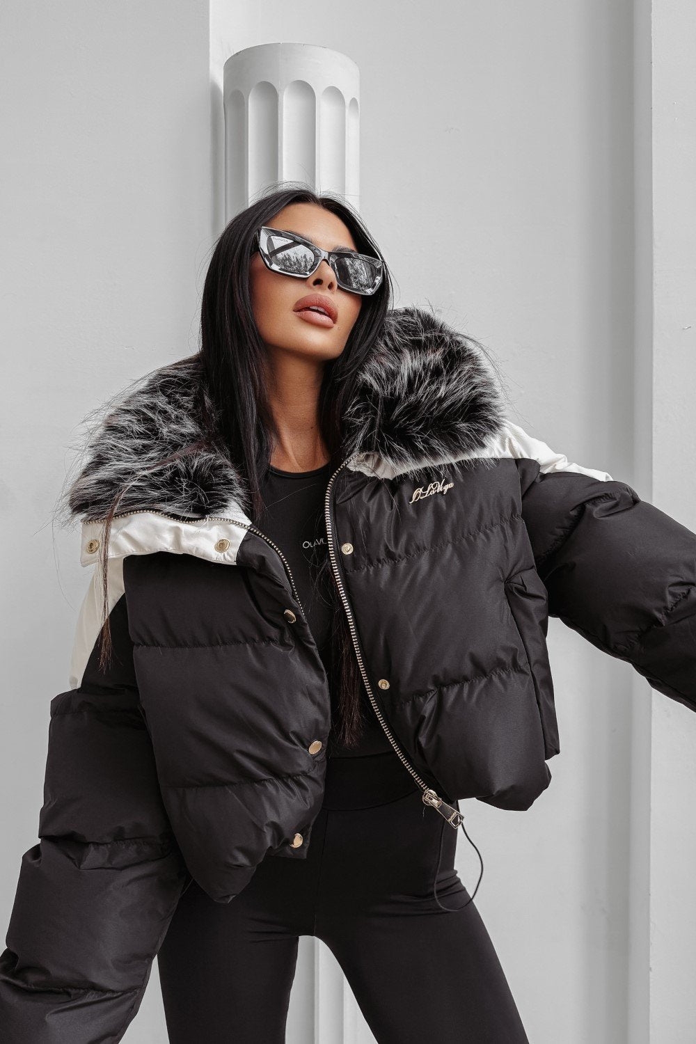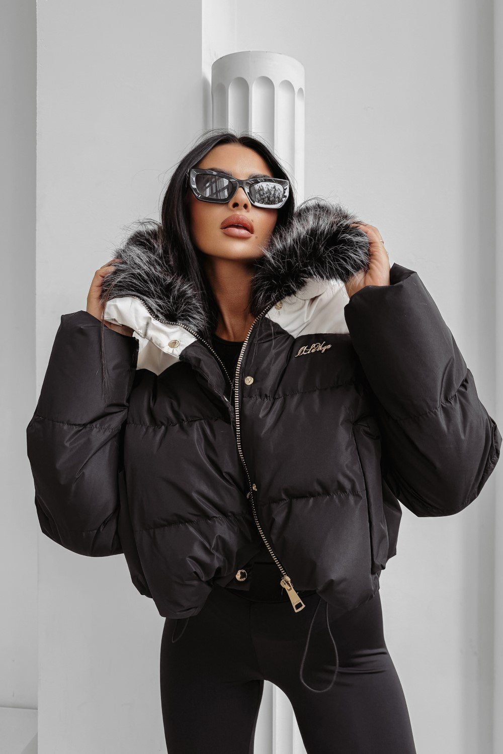 Rövidebb fazonú pehelykabát magas gallérral. Könnyű, mégis meleg, cipzáras záródással és oldalzsebekkel.