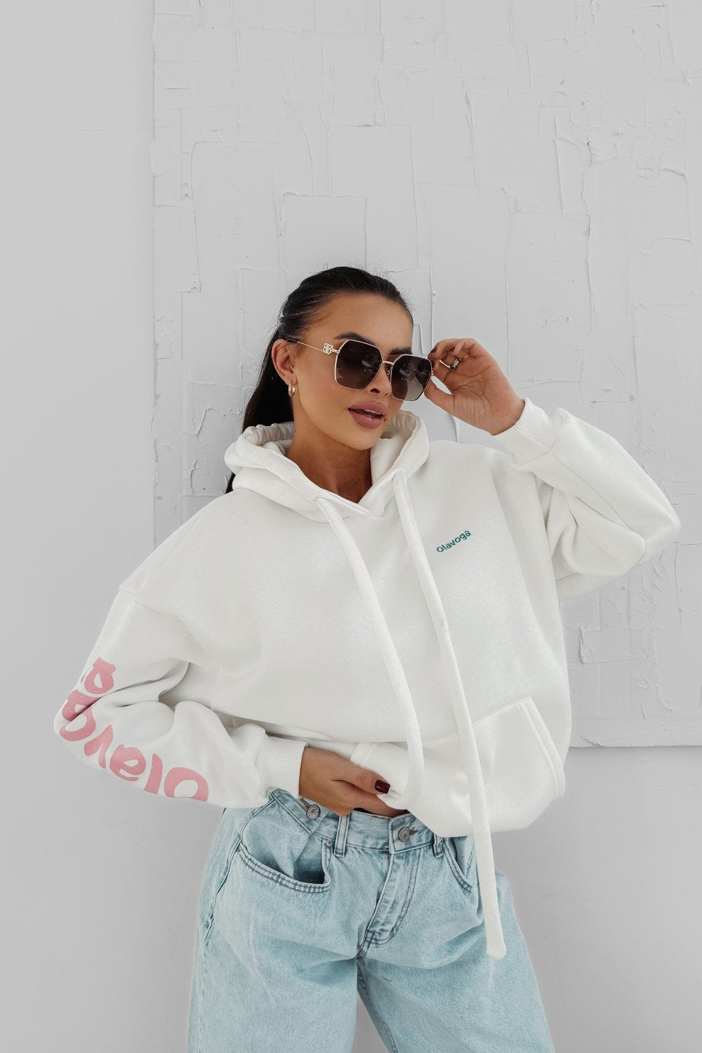 Oversize kapucnis pulóver hosszabb fazonnal. Különösen puha, komfortos anyagból, elöl nagy méretű kontrasztos logónyomattal.