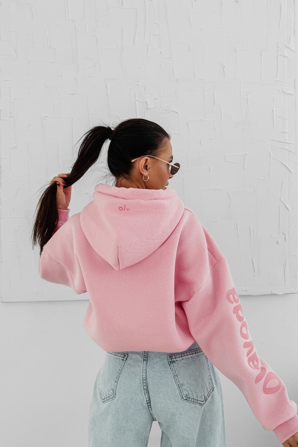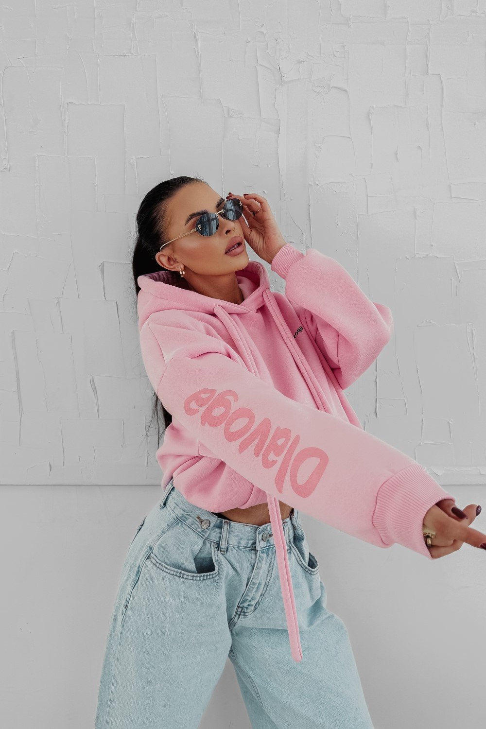 Oversize kapucnis pulóver hosszabb fazonnal. Különösen puha, komfortos anyagból, elöl nagy méretű kontrasztos logónyomattal.