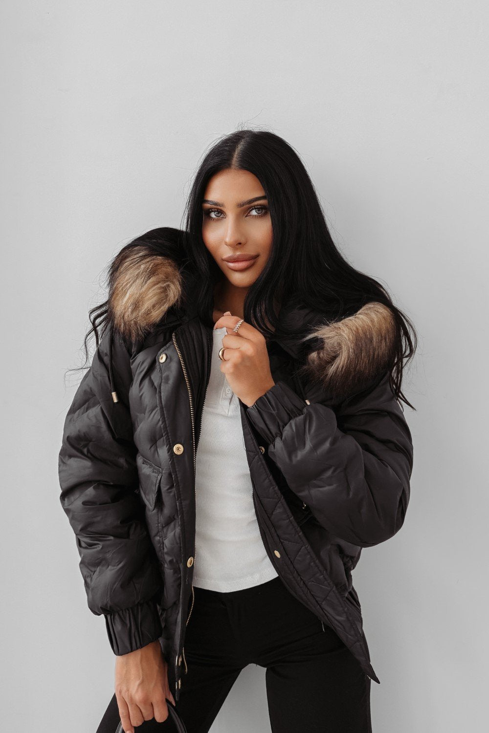 Rövidebb, pufi női kabát klasszikus stílusban. Meleg, kényelmes, letisztult részletekkel és visszafogott logóval.