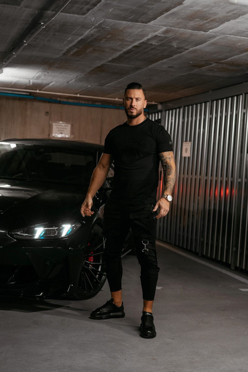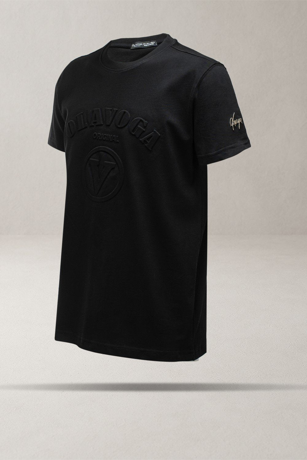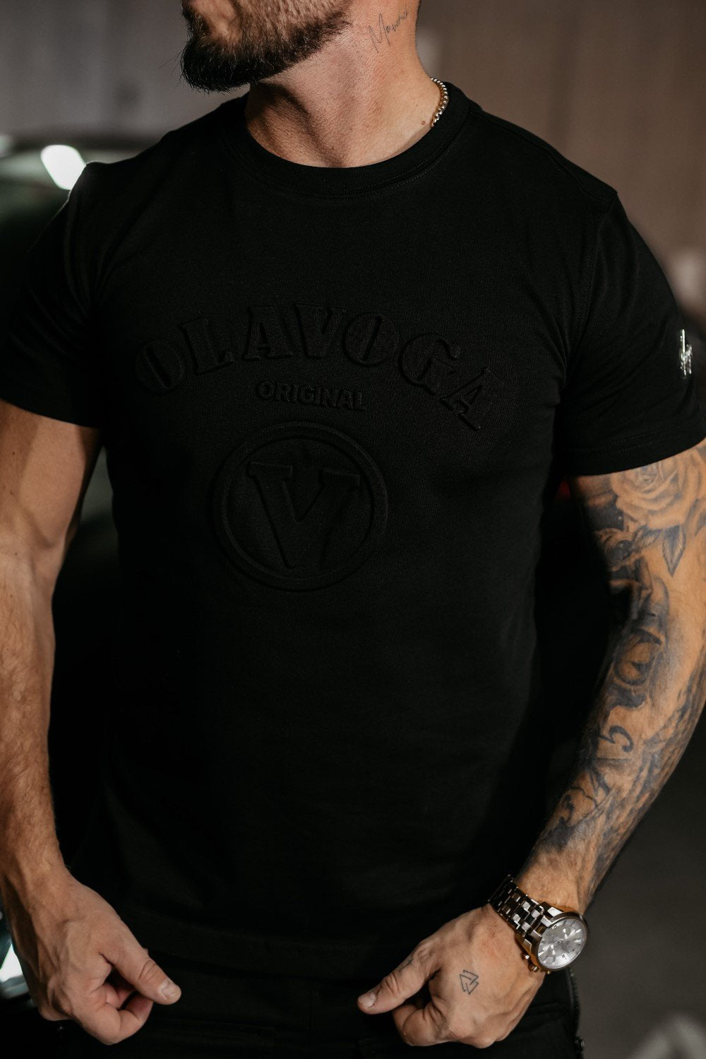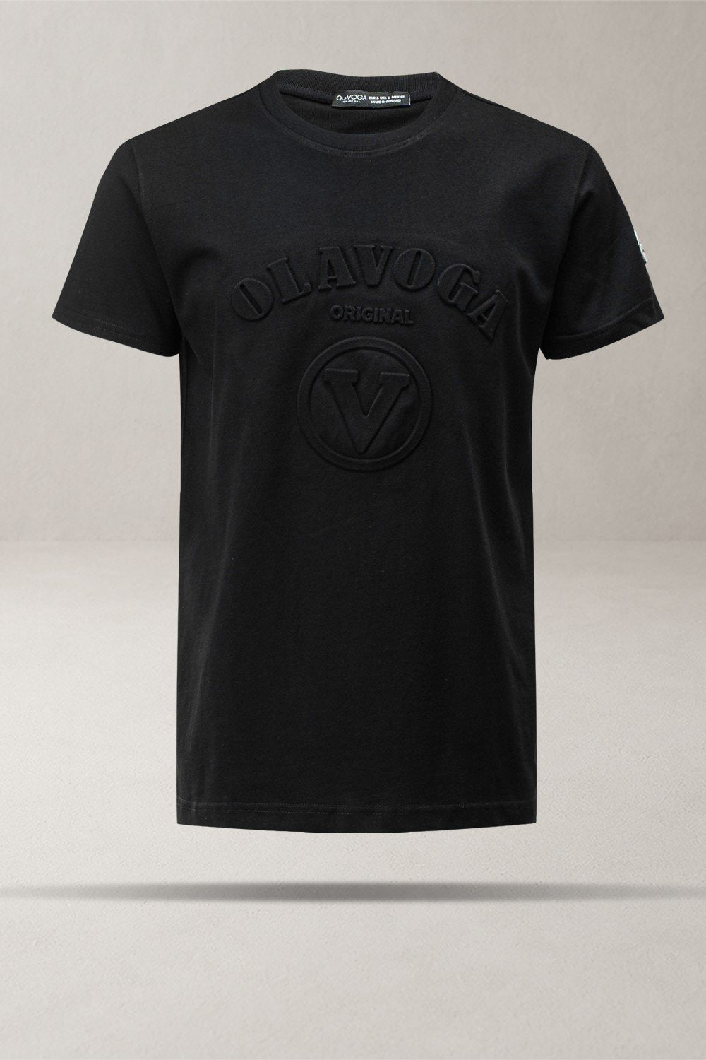 Laza stílusú, rövid ujjú férfi póló, 100% prémium minőségű pamutból. A mellrészt dombornyomott OLAVOGA ORIGINAL logó és egy látványos „V” alakú emblema díszíti. Az egyik ujján arany színű, diszkrét logós applikáció található, amely kiemeli az exkluzív megjelenést.