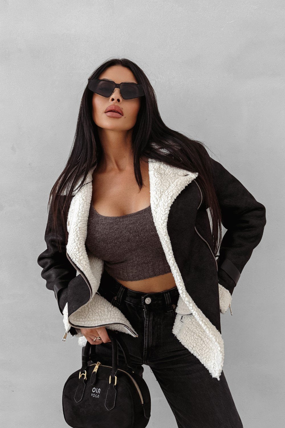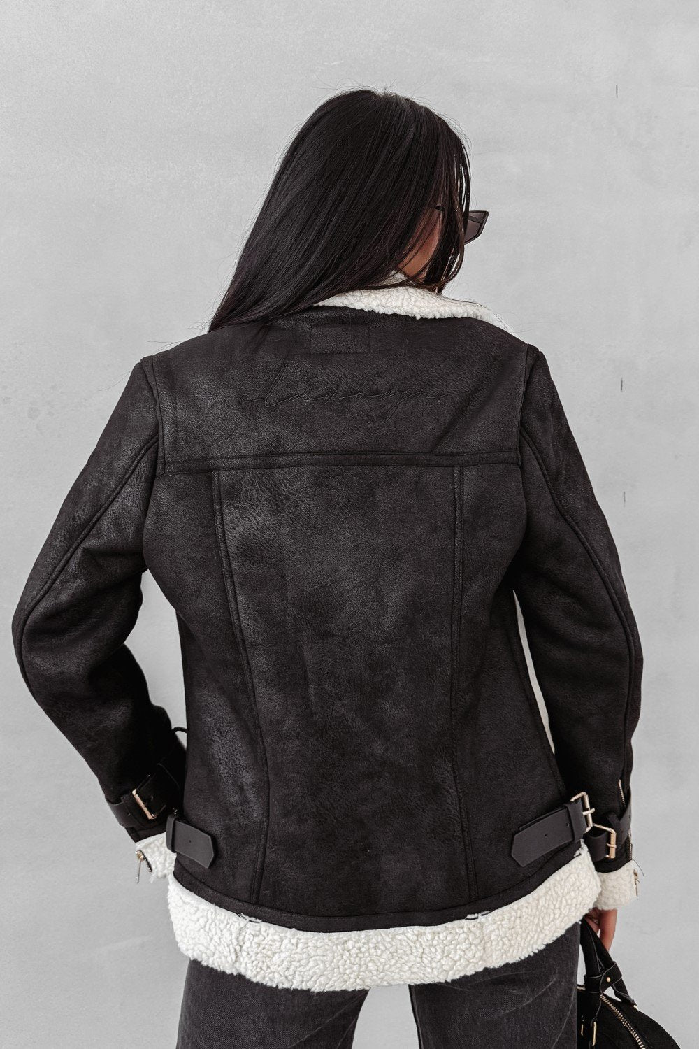 Aviator stílusú női kabát minőségi anyagból. Meleg béléssel, karakteres gallérral és fémes részletekkel.
