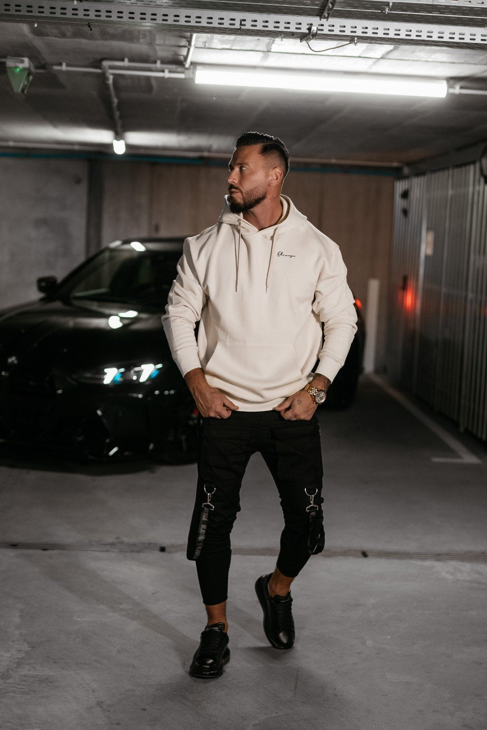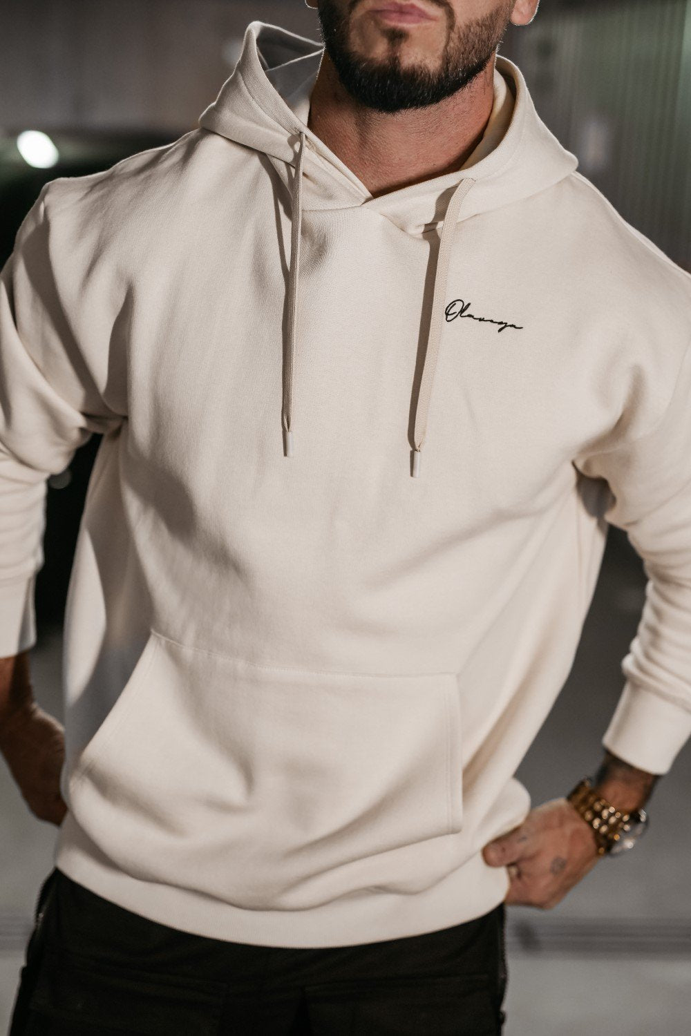 Laza stílusú, kapucnis pulóver, amely kiváló minőségű, puha és prémium pamutból készült. A mellrészen finom, írott hatású OLAVOGA hímzés díszíti. Praktikus kenguruzsebbel és állítható kapucnival rendelkezik, amelyet vastag húzózsinór egészít ki.