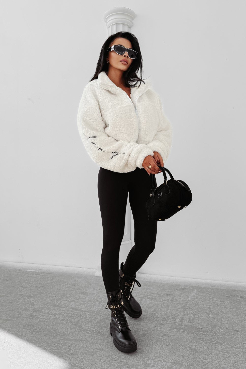 Puha, „teddy” típusú anyagból készült, viszkóz tartalommal. Az egyik ujját diszkrét, hímzett OLAVOGA logó díszíti. A fazon magas állógallérral és elöl található praktikus zsebekkel lett kialakítva.