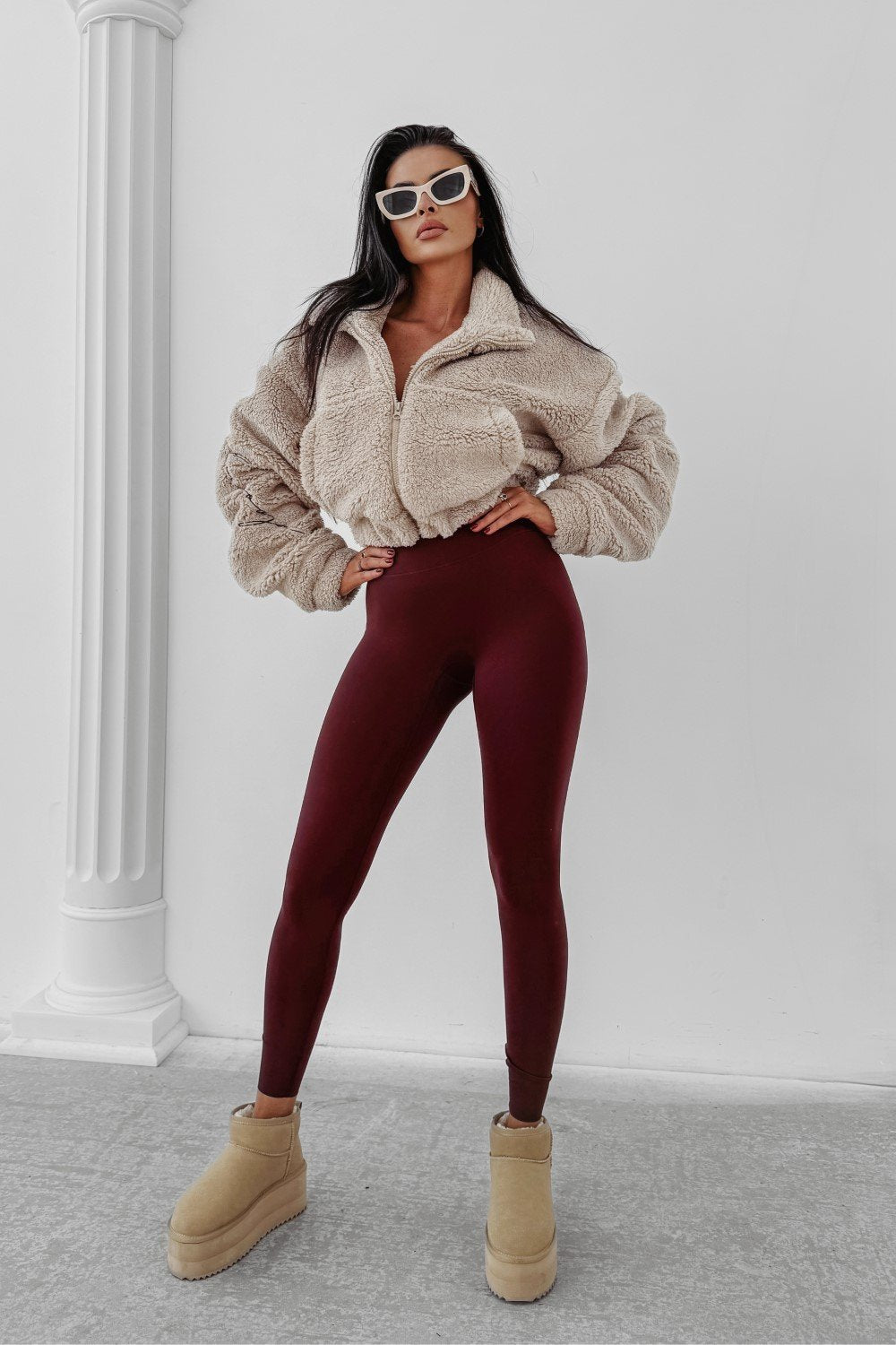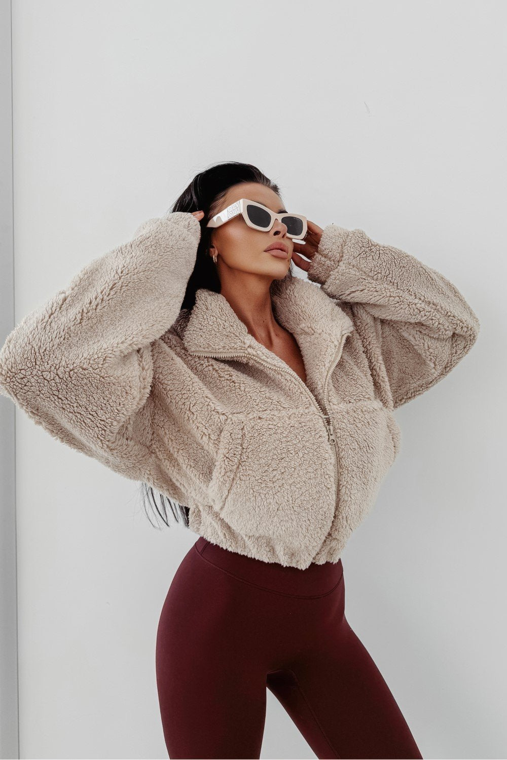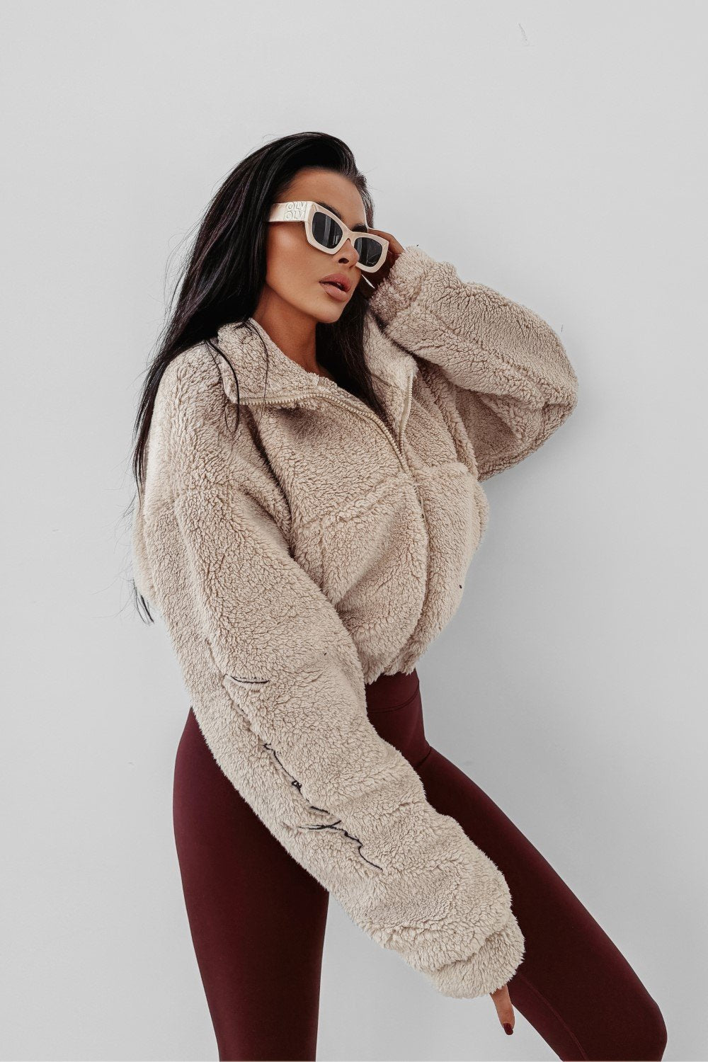 Puha, „teddy” típusú anyagból készült, viszkóz tartalommal. Az egyik ujját diszkrét, hímzett OLAVOGA logó díszíti. A fazon magas állógallérral és elöl található praktikus zsebekkel lett kialakítva.