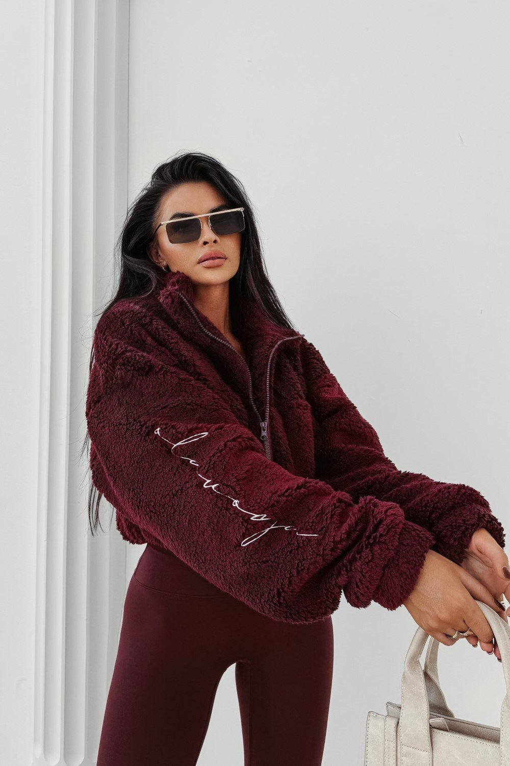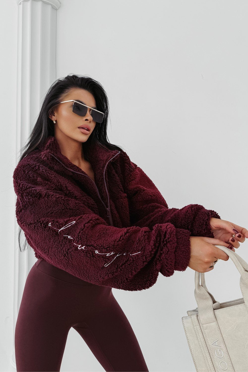 Puha, „teddy” típusú anyagból készült, viszkóz tartalommal. Az egyik ujját diszkrét, hímzett OLAVOGA logó díszíti. A fazon magas állógallérral és elöl található praktikus zsebekkel lett kialakítva.