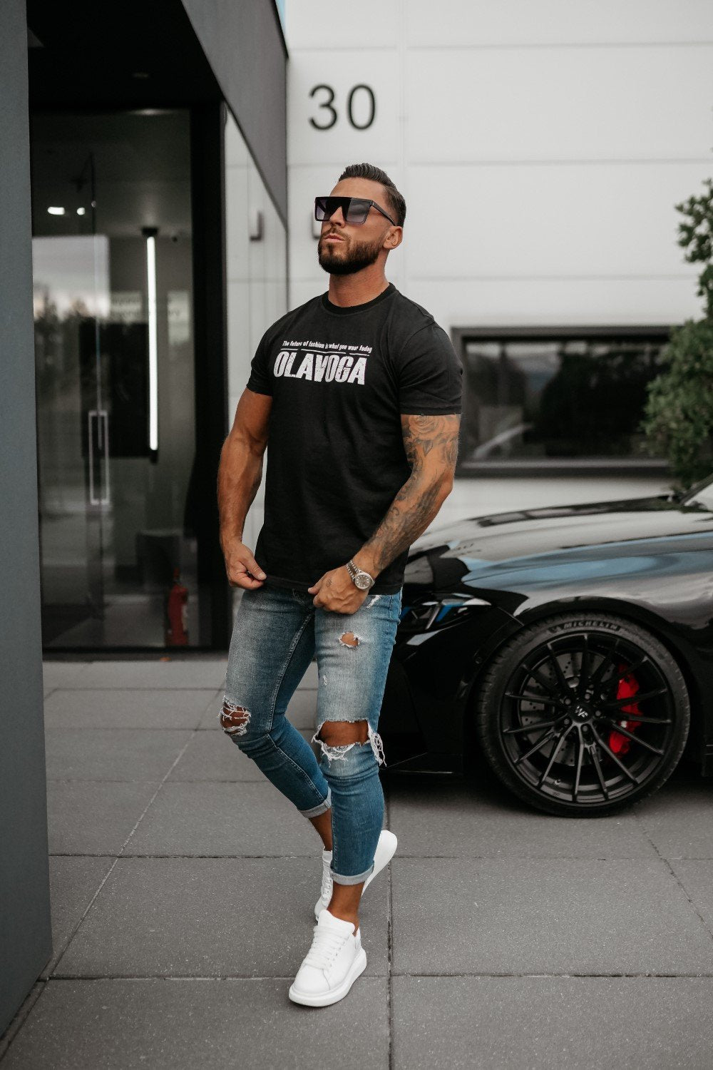 Férfi rövid ujjú póló klasszikus szabással. Pamut anyagból, mellkason OLAVOGA logónyomattal.